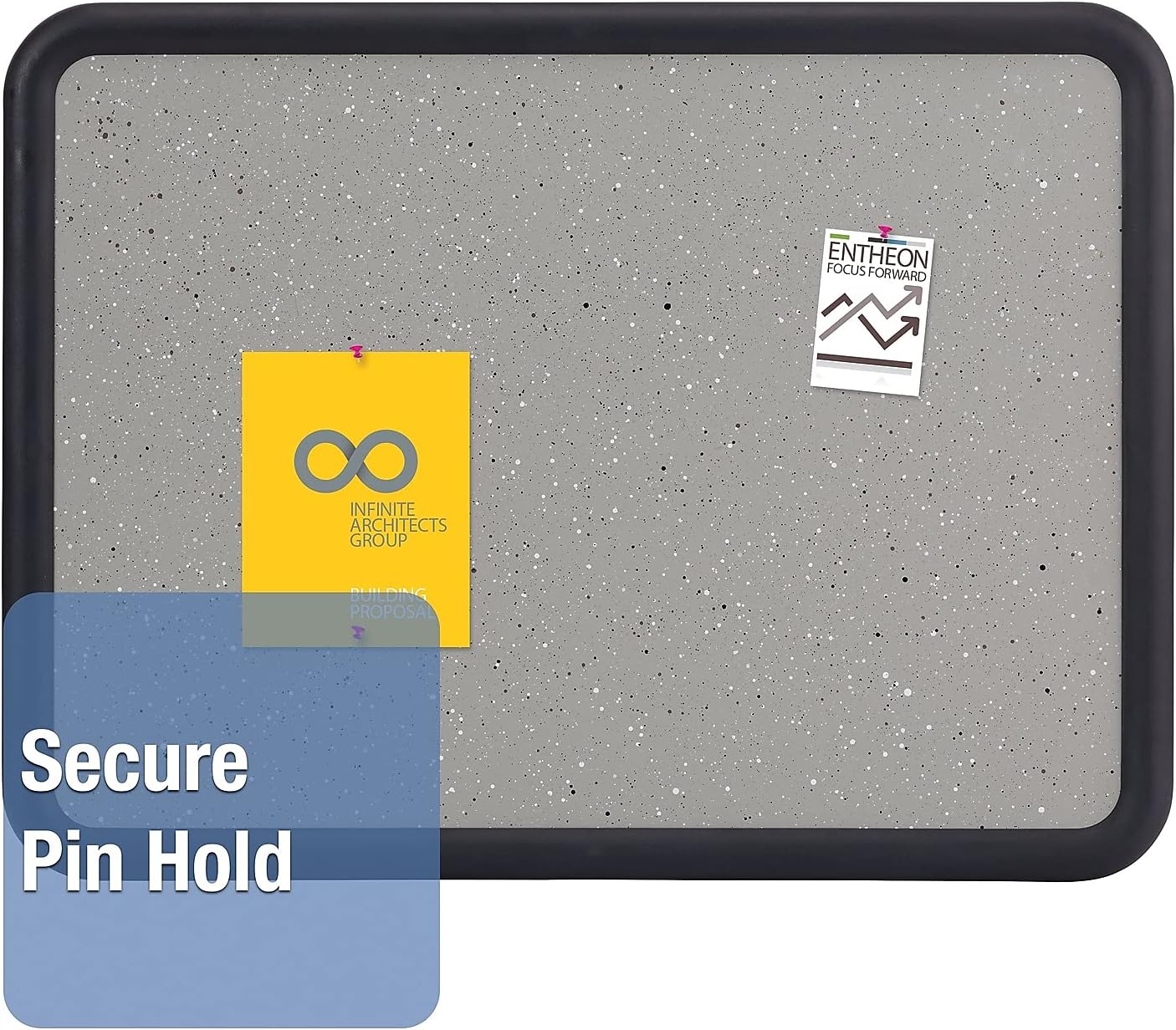 - Durable granite-colored bulletin board surface with matching plastic frame secures documents with push pins