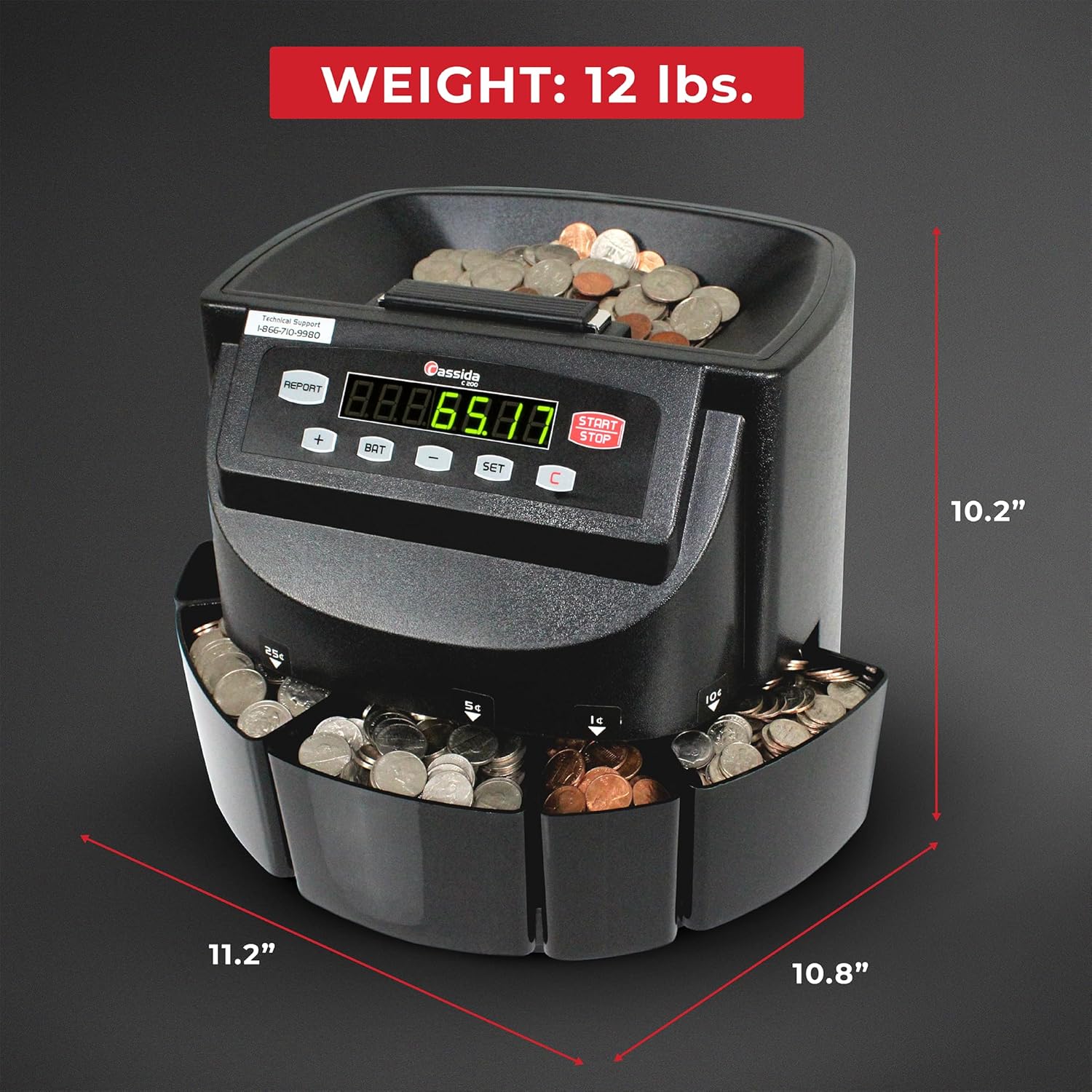 - [EFFICIENT and ACCURATE]: The Cassida C200 accurately processes all U.S. coins (Pennies, Nickels, Dimes, Quarters and Dollar Coins) at a speed of 300 coins per minute with a hopper capacity of 2,000 coins and a bin capacity of 900 coins