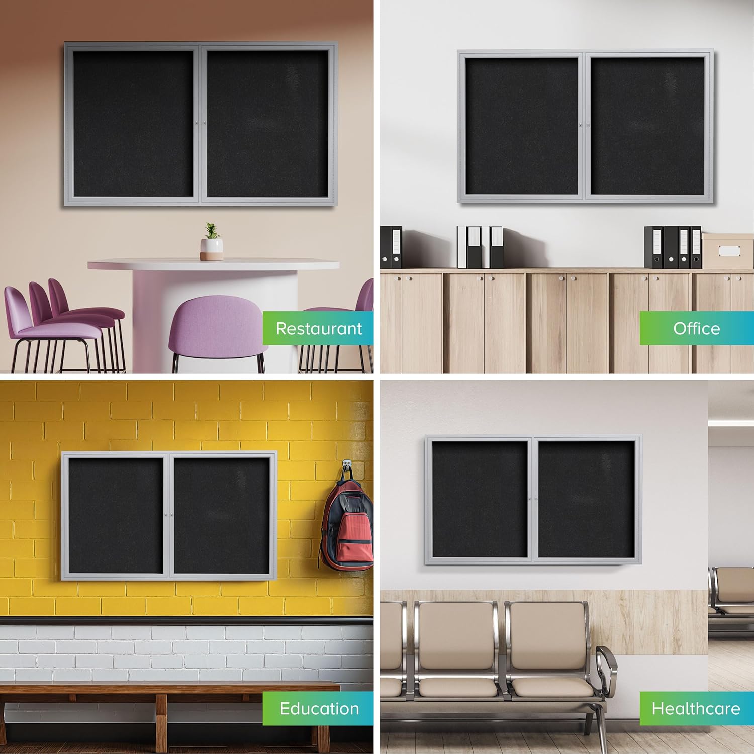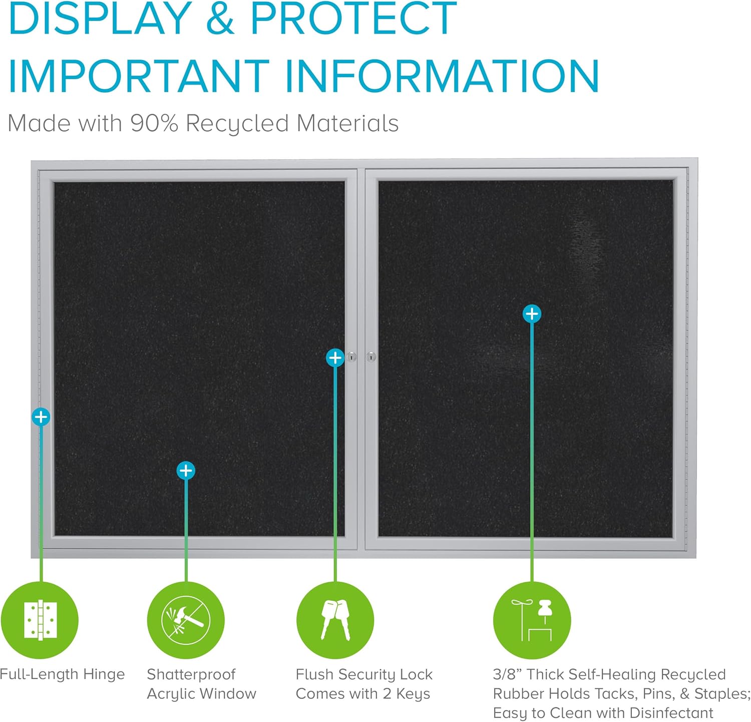 Ghent 36" x 48" 2-Door indoor Enclosed Recycled Rubber Bulletin Board, Shatter Resistant, with Lock, Satin Aluminum Frame,Black (PA234TR-BK) ,Made in the USA