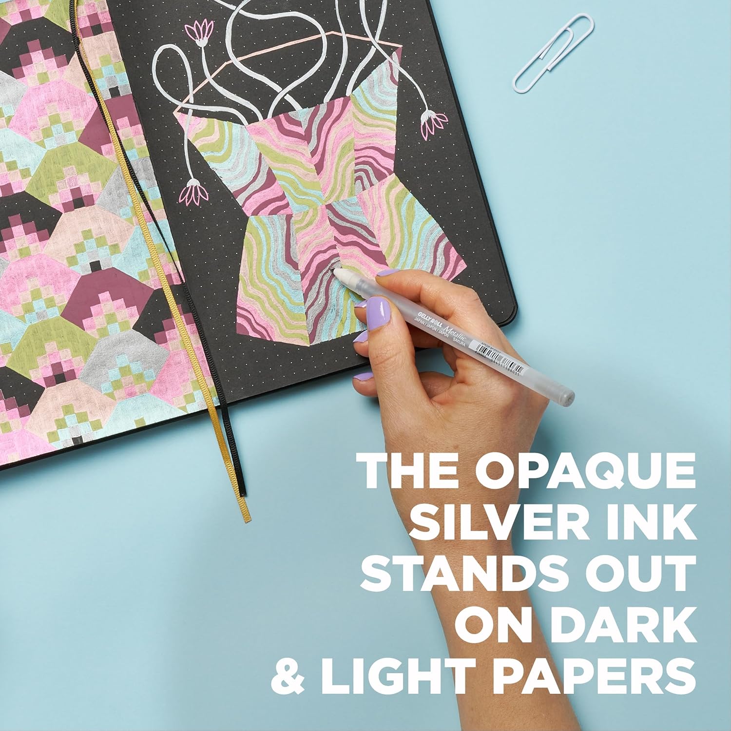- Metallic, Opaque Silver Ink: Gel pens have metallic silver ink that flow creamy smooth onto light and dark paper