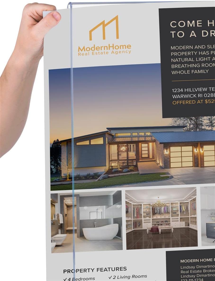 - 67"h Poster holder with business card attachment is clear to makes contents visible