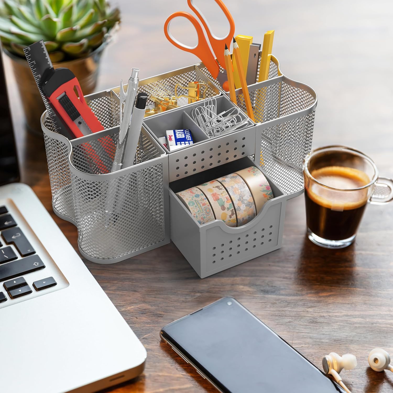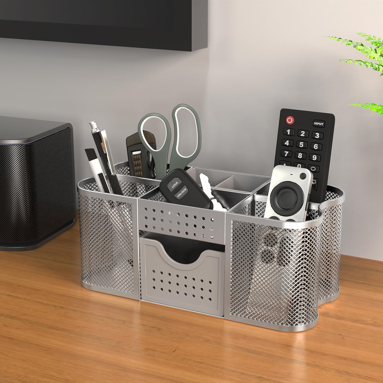- [ Wire Mesh Desk Organizer ] Designed with 5 divided compartments to neatly organize all your writing instruments and small office supplies.