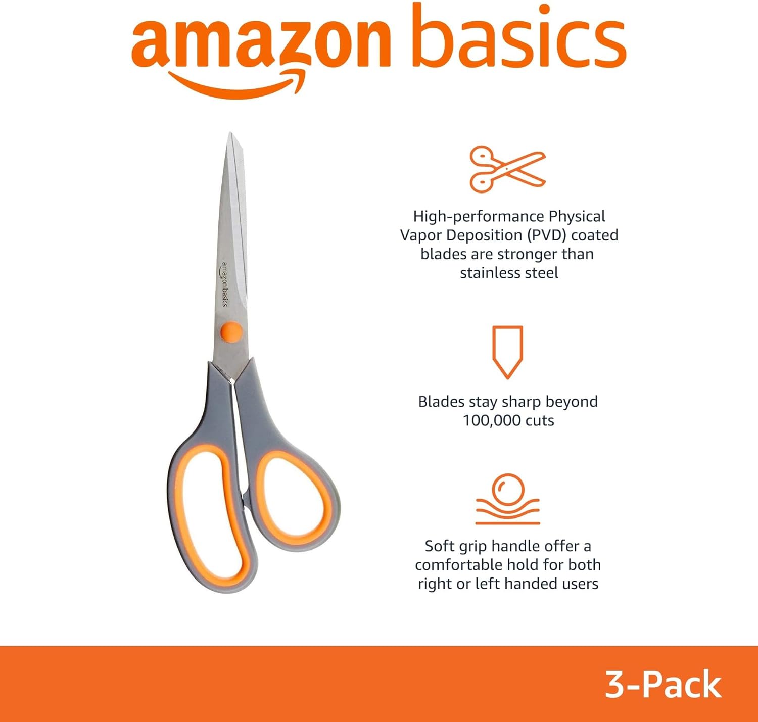 Amazon Basics Stainless Steel Scissors for Office, Crafts, Multipurpose, Sharp, Comfort Grip, PVD Coated, 3 Pack, Multicolor