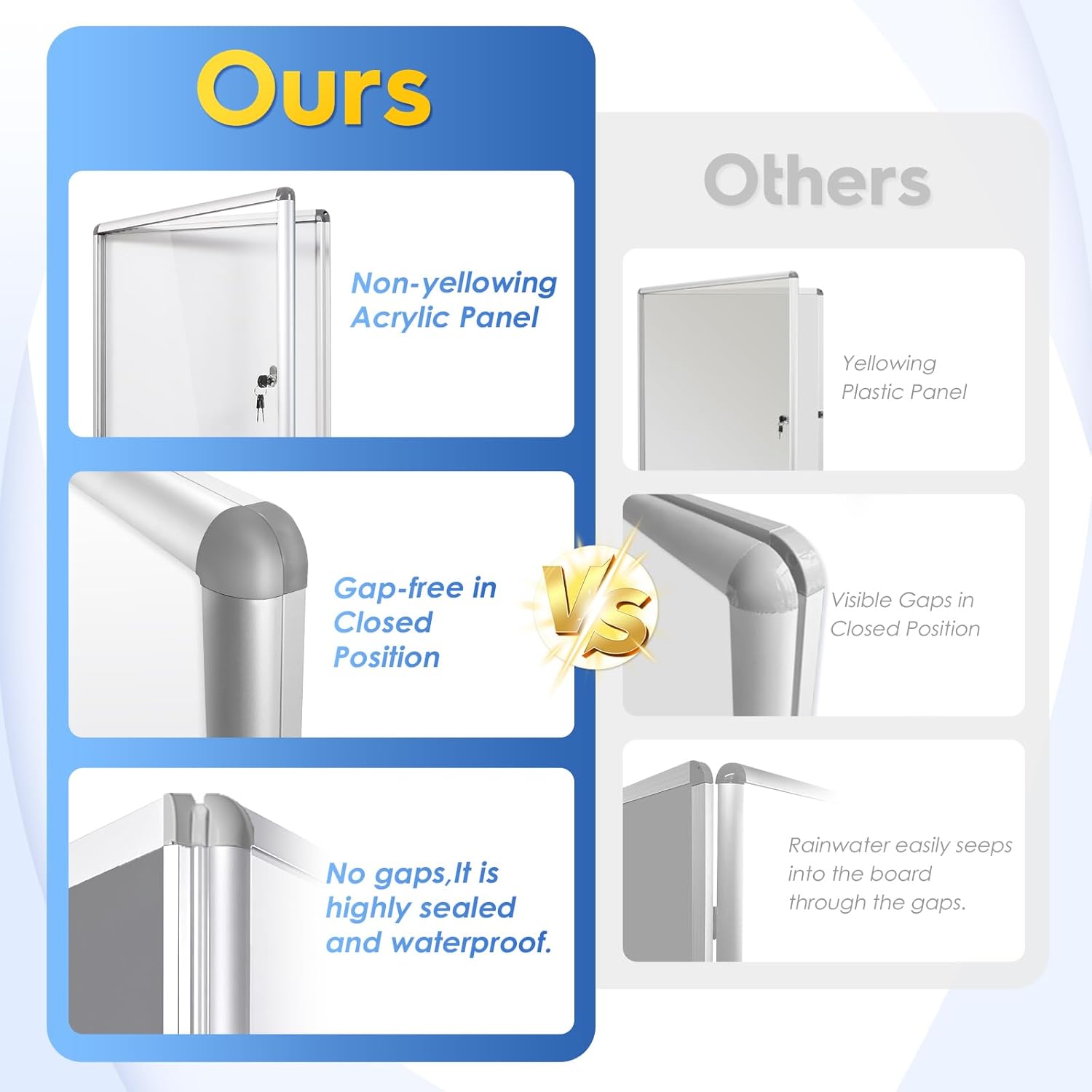 - Secure and Protected Display —Lockable acrylic doors and key mechanisms ensure that important information are kept safe from the elements, theft, or tampering.