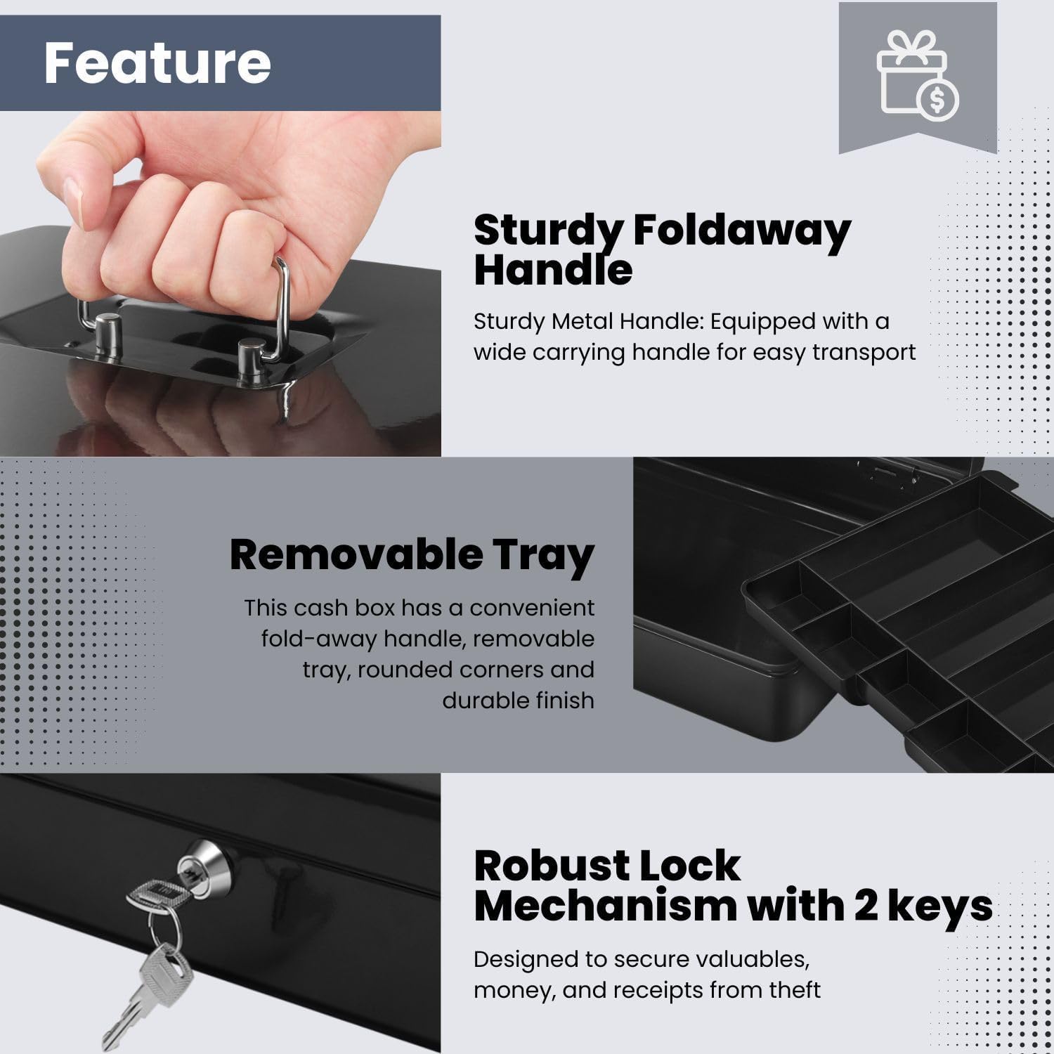 - Sleek and Functional Design - Flaunting a sleek black design, Flexzion's locking cash box is functional and adds a professional touch to your business operations, as they are tailored to fit currency, coins, bills, and checks