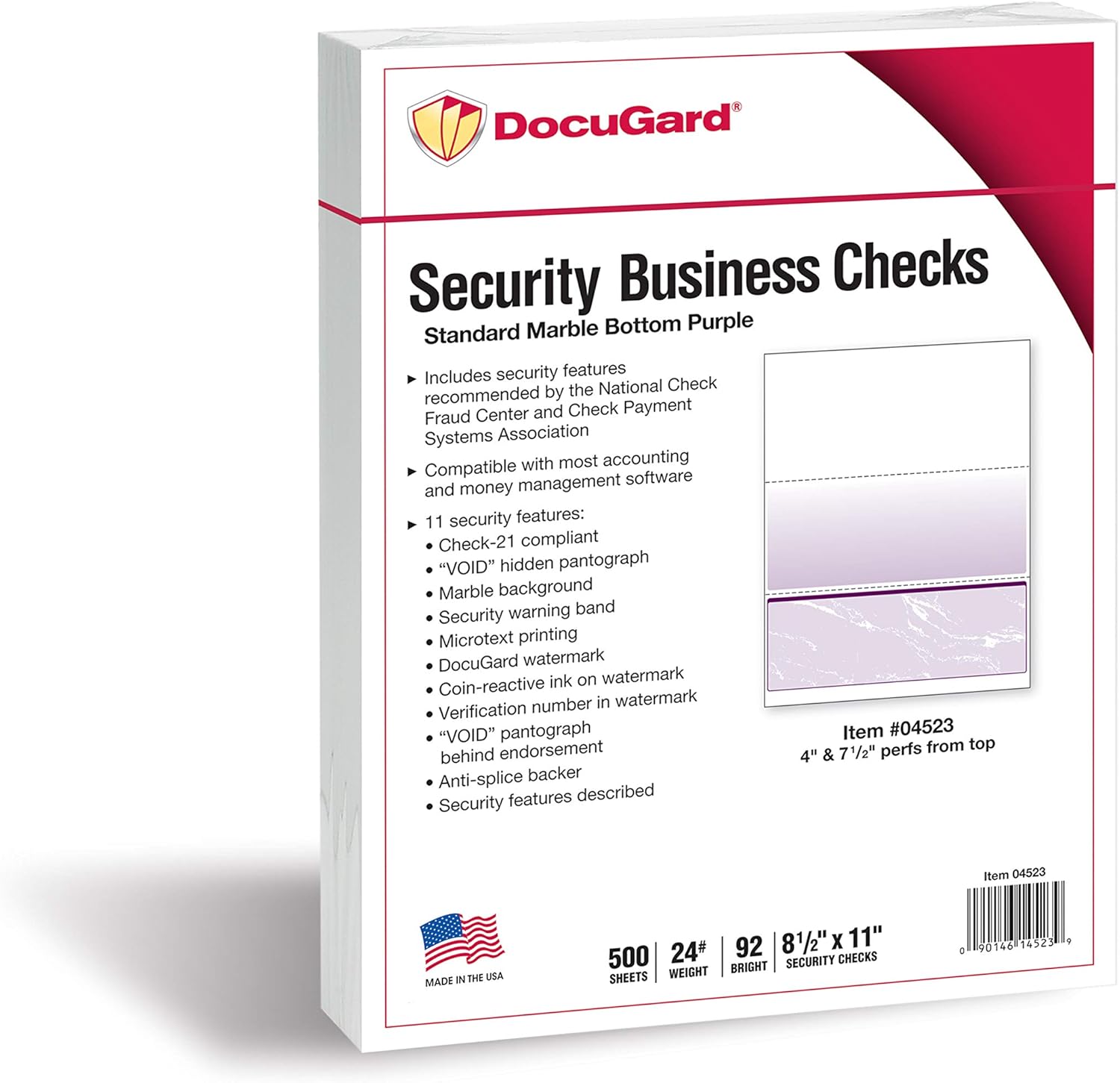 - Front security features include: Check-21 compliancy; hidden message technology (“VOID” appears when copied); a printed marble background that shows alterations when erased; and a printed security warning to call attention to the security features listing on the reverse side.Back security features include: security features listing for verification purposes; hidden message technology (“VOID” appears behind endorsement when copied); microtext printing which is legible when magnified, but illegible when copied; anti-splice backer that is difficult to alter; and a verification number and watermark that are printed in coin-reactive ink and can only be seen when viewed on an angle.Premium DocuGard quality since 1964. Made in the USA from domestically sourced, environmentally friendly paper..500 sheets, 8.5 x 11 check printing paper, 24 lb., packaged in an easy-open shrinkwrap