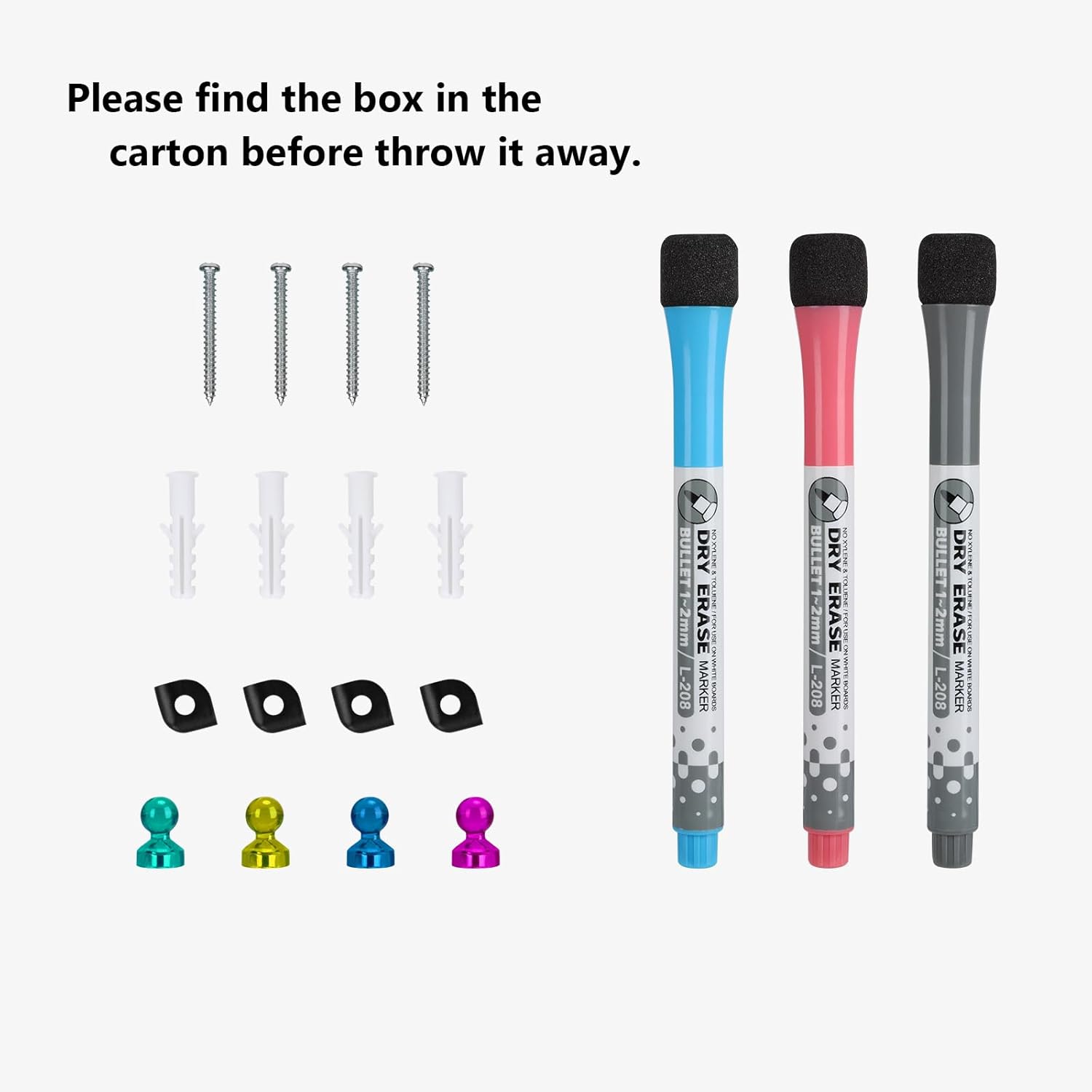 - 【Premium Magnetic White Board】Overall Size (frame included): 47.6" x 34.6", Writing Surface Size: 46.5" x 33.2"; Comes with 3 dry erase markers, 4 magnets, 1 pen holder and fixing kits. Great help for business professional, project manager, clerk, teacher, student and parent etc.