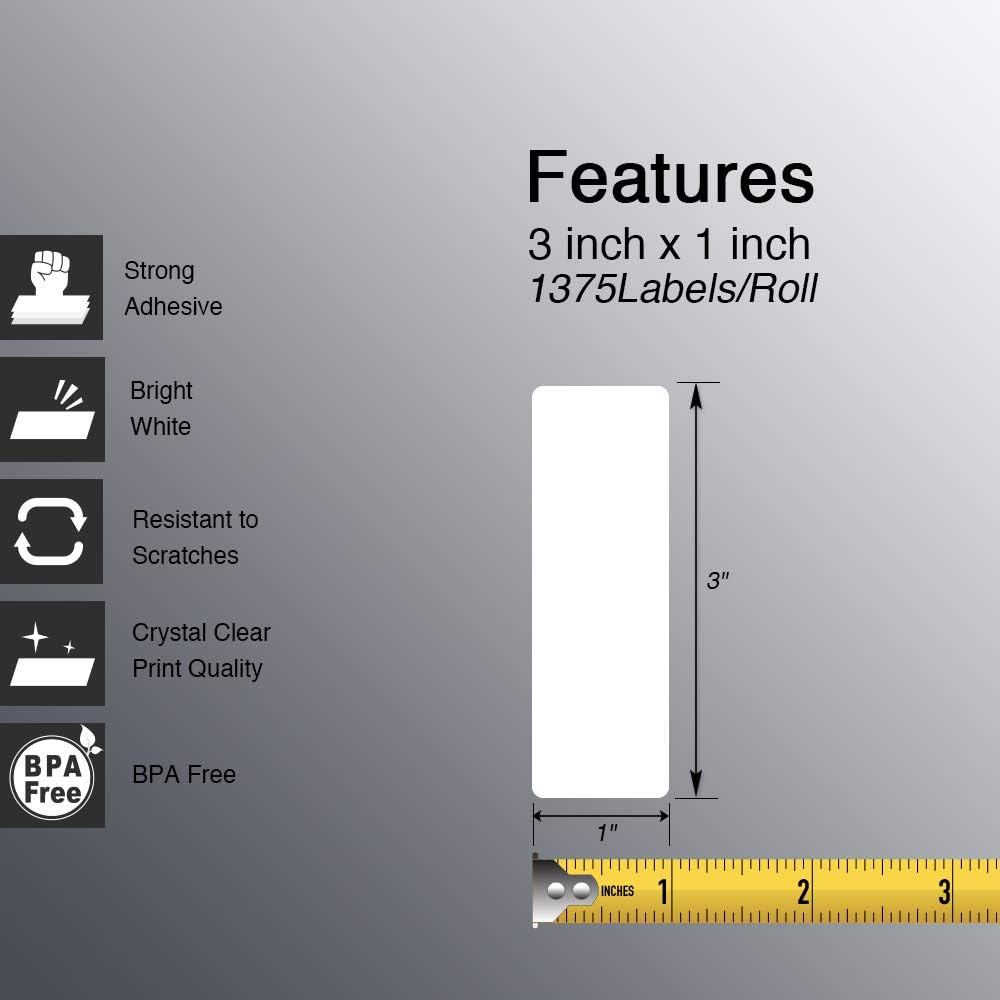 - [ Specifications ]: 3 in x 1 in (76 mm x 25 mm) (1375 Labels/Roll, 10 Rolls),Paper tube diameter:1"(25.4mm). No Ink Toner or Ribbons Needed! Save your money and effort.