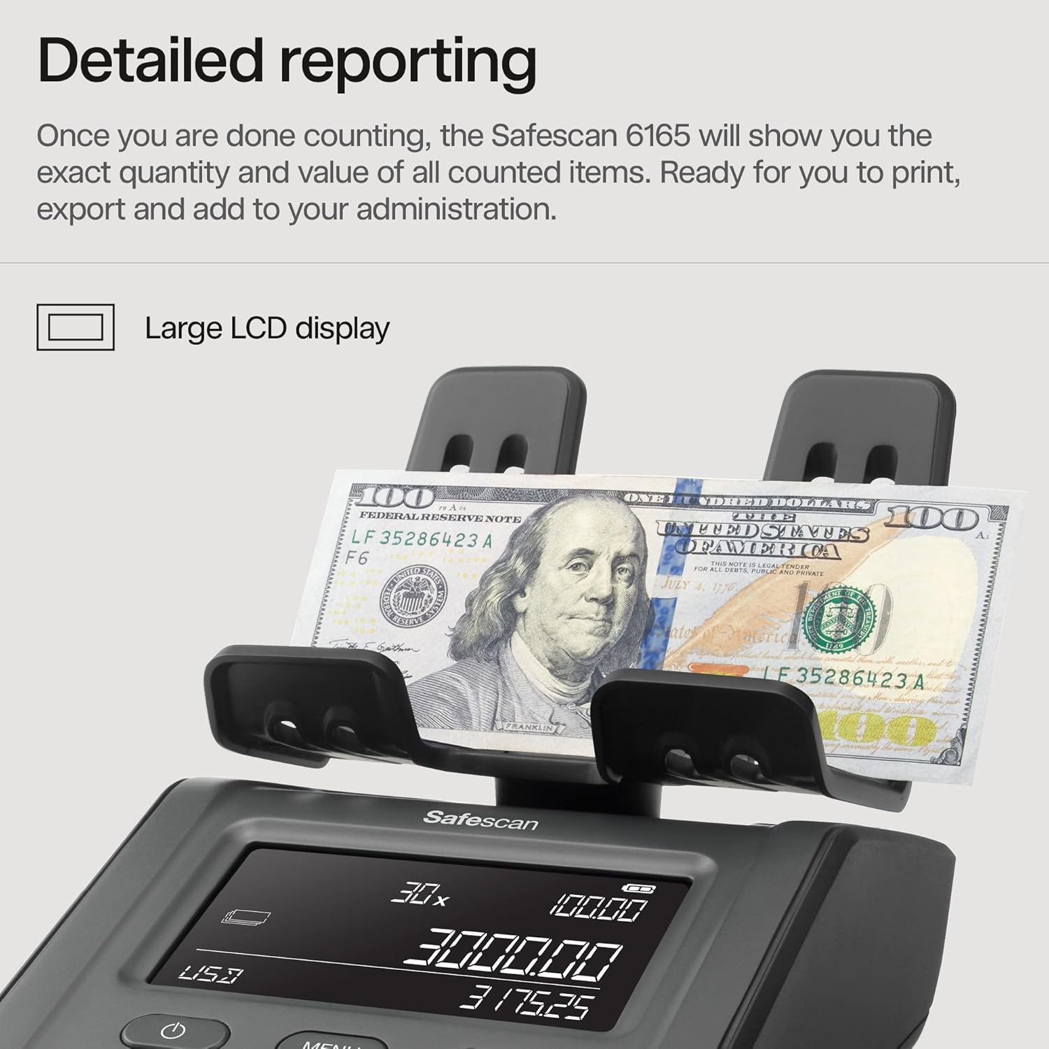 - FAST AND EFFICIENT: The Safescan 6165 Advanced Money Counting Scale allows you to choose the currency and denomination that is being counted and save the information in under two minutes