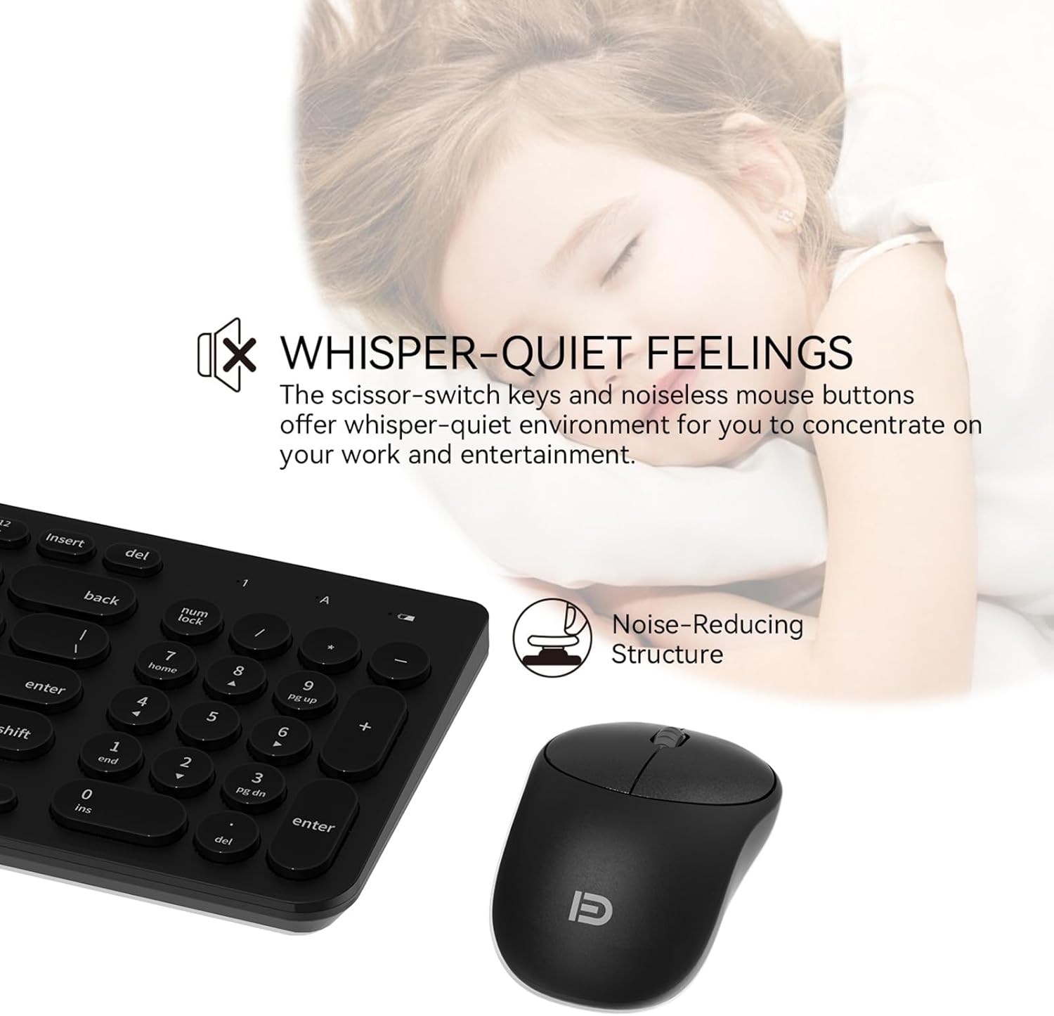 FD Wireless Keyboard and Mouse Combo - 2.4GHz USB Cordless, Cute Round Keys, Quiet and Slim Set for Laptop, Computer, TV, and Mac - Black