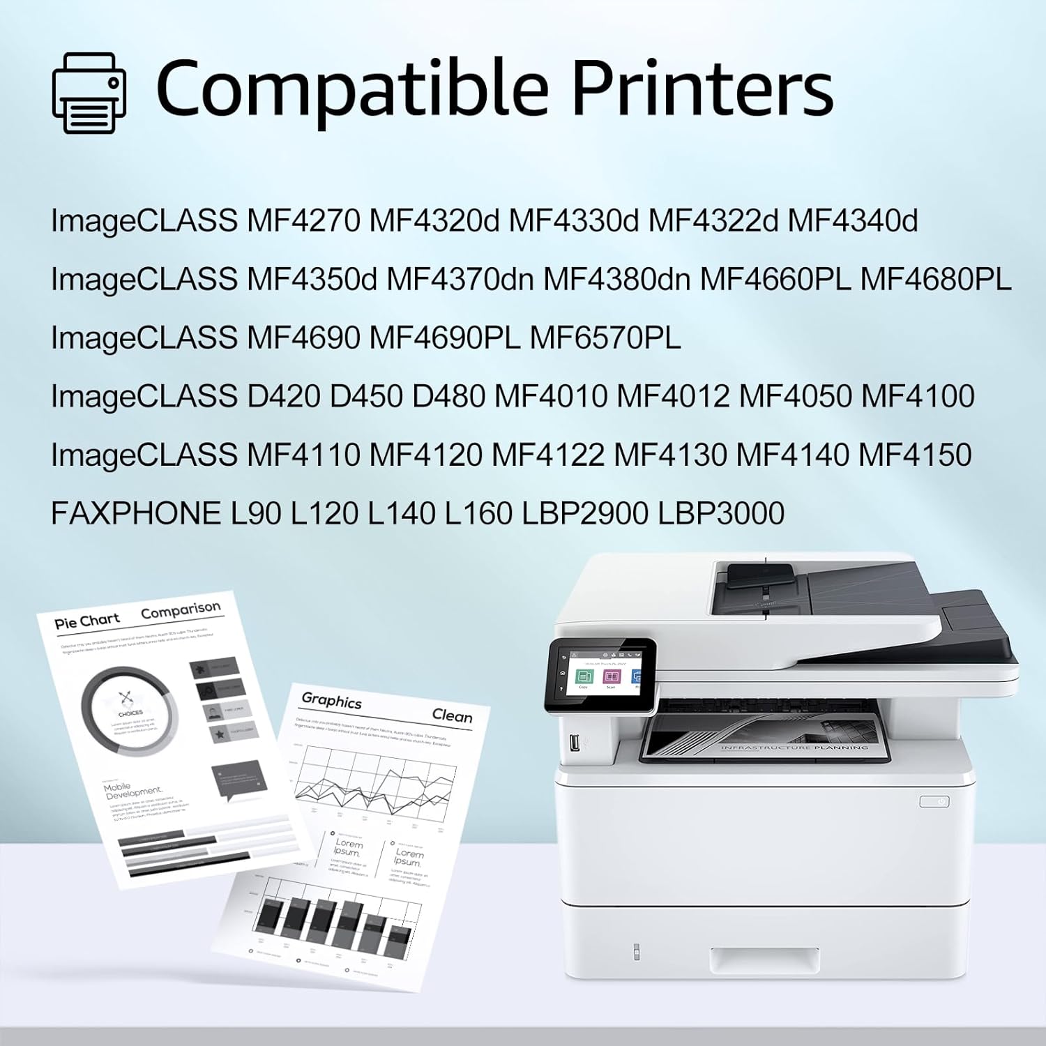 - Compatible for Canon Printer: FAXPHONE L90 / L120 / L140 / L160 / LBP-2900 / LBP-3000, ImageCLASS D420 / D450 / D480 / MF4010 / MF4012 / MF4050, ImageCLASS MF4100 / MF4110 / MF4120 / MF4122 / MF4130 / MF4140 / MF4150 / MF4270 / MF4320d / MF4330d / MF4322d MF4340d / MF4350d / MF4370dn / MF4380dn MF4660PL / MF4680PL / MF4690 / MF4690PL / MF6570PL, LaserJet 1010 / 1012 / 1015 / 1018 / 1020 / 1022 / 1022N / 1022NW / 3015 / 3020 / 3030 / 3050/ 3050Z / 3052 / 3055 /M1319F MFP / M1005F MFP Printers.