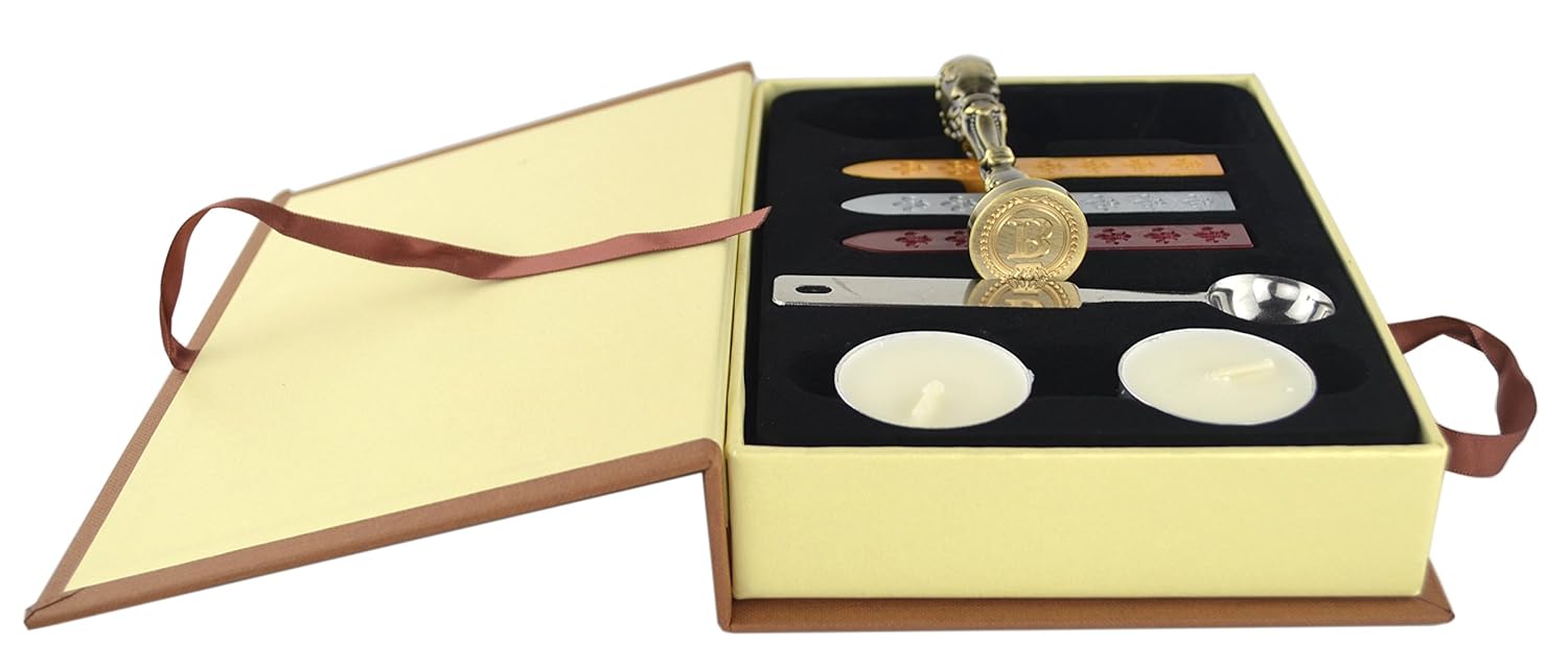 - Creative Box -- An old mysterious book style packing contains 1pc * Wax Stamp, 1pc* Wax Spoon, 2pc*white Wax,3pc* Sealing Wax Stick(Gold, Silver, Dark Red)