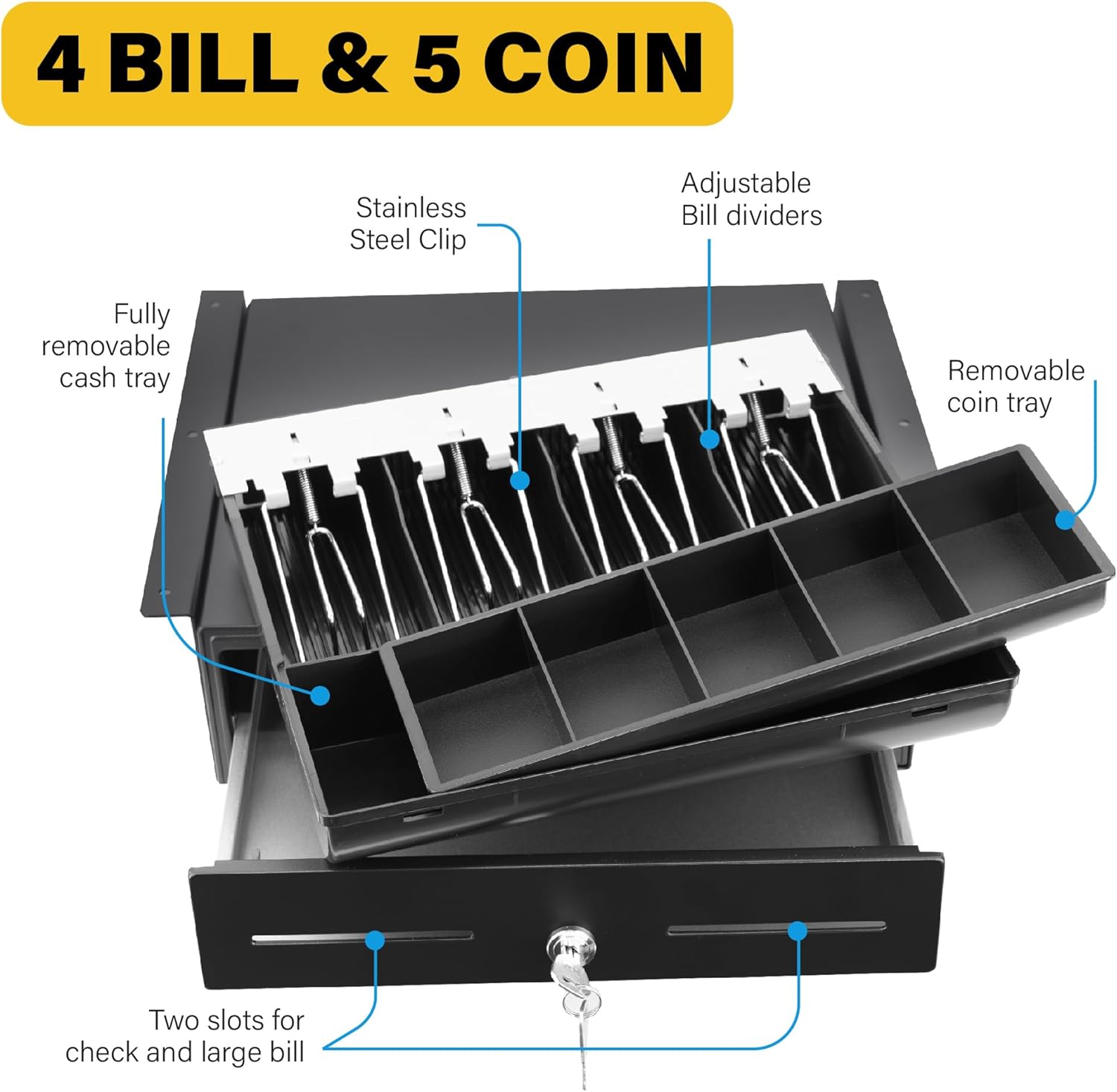 - 📏Compact Design: Designed to fit snugly in small spaces while offering ample storage. It features a 4-Bill and 5-Coin till, allowing for organized cash management. Size: 13 x 13.5 x 4 inch (Width x Length x Height).