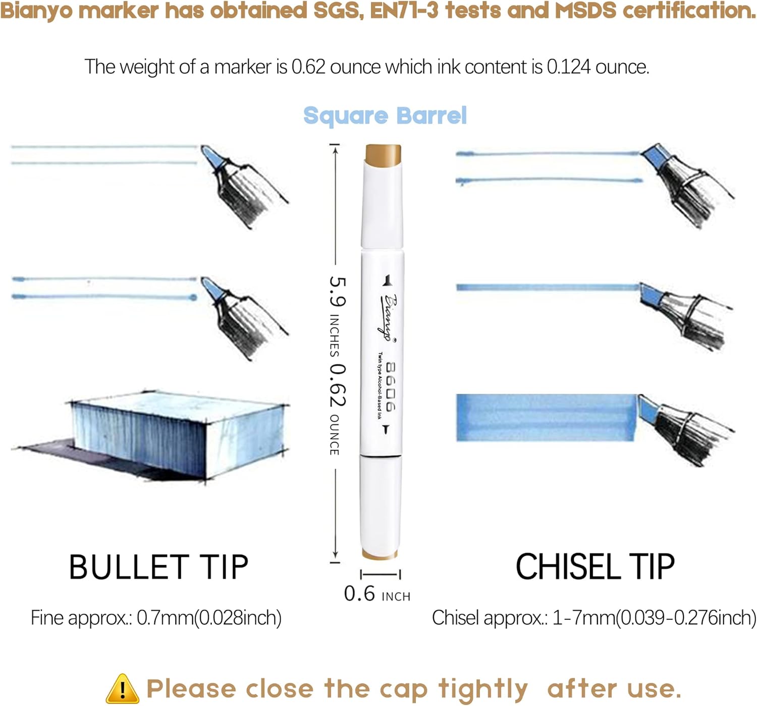 - Alcohol-Based & Dual Nibs: Bianyo artist markers with alcohol-based ink that have obtained SGS, EN71-3 tests and MSDS certification. Excellent smudge-proof and waterproof qualities on most surfaces. The total weight of a marker is 0.62 ounces and the ink content is 0.124 ounces. Dual nibs are broad chisel (approx. 1-7mm) and fine point(approx. 0. 7mm) nibs. We did a writing test with the equipment. The broad chisel nib can last 328 feet. The fine point nib can last up to 1738 feet