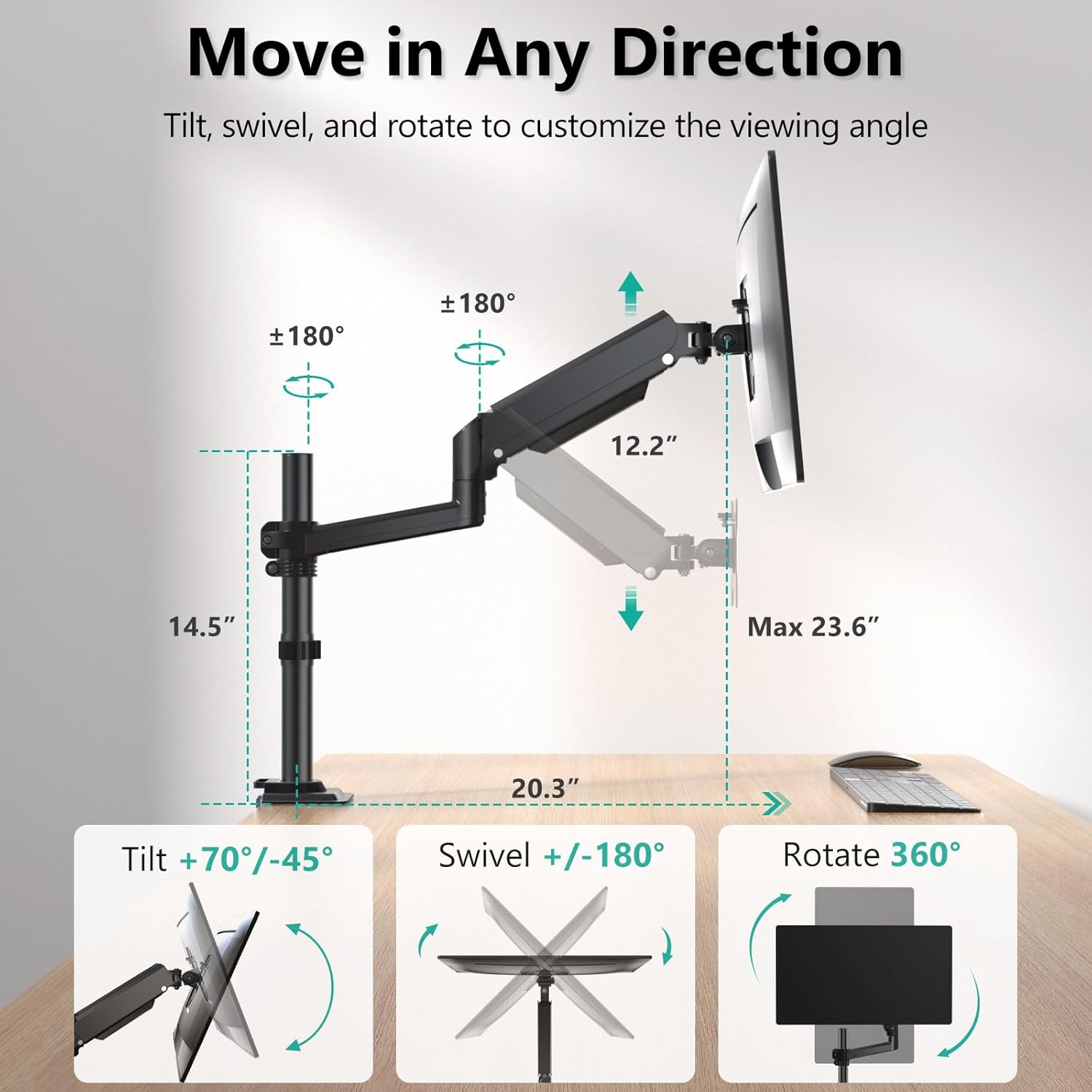 - Fully Adjustable: The Gas Spring Stand Can Tilt +70°/-45°, Swivel +/-180°, And Rotate 360°. Max Height Is Up To 23.6", And Max Extension Is Up To 20.3"