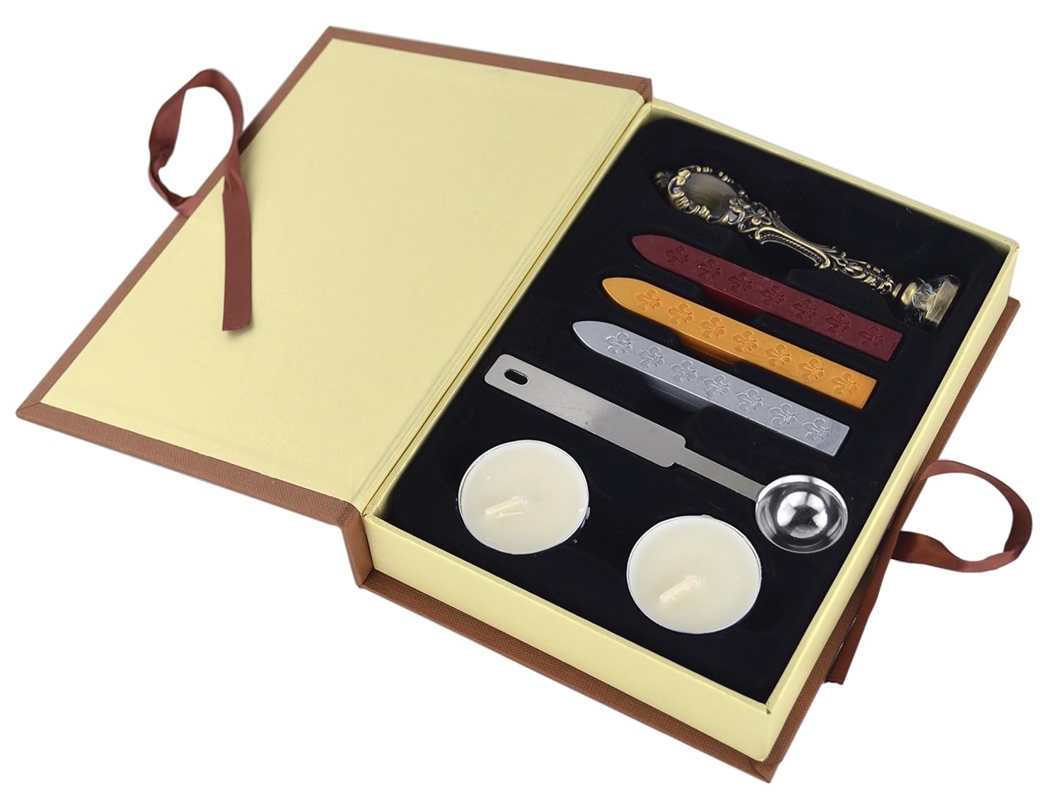 - Creative Box -- An old mysterious book style packing contains 1pc * Wax Stamp, 1pc* Wax Spoon, 2pc*white Wax,3pc* Sealing Wax Stick(Gold, Silver, Dark Red)