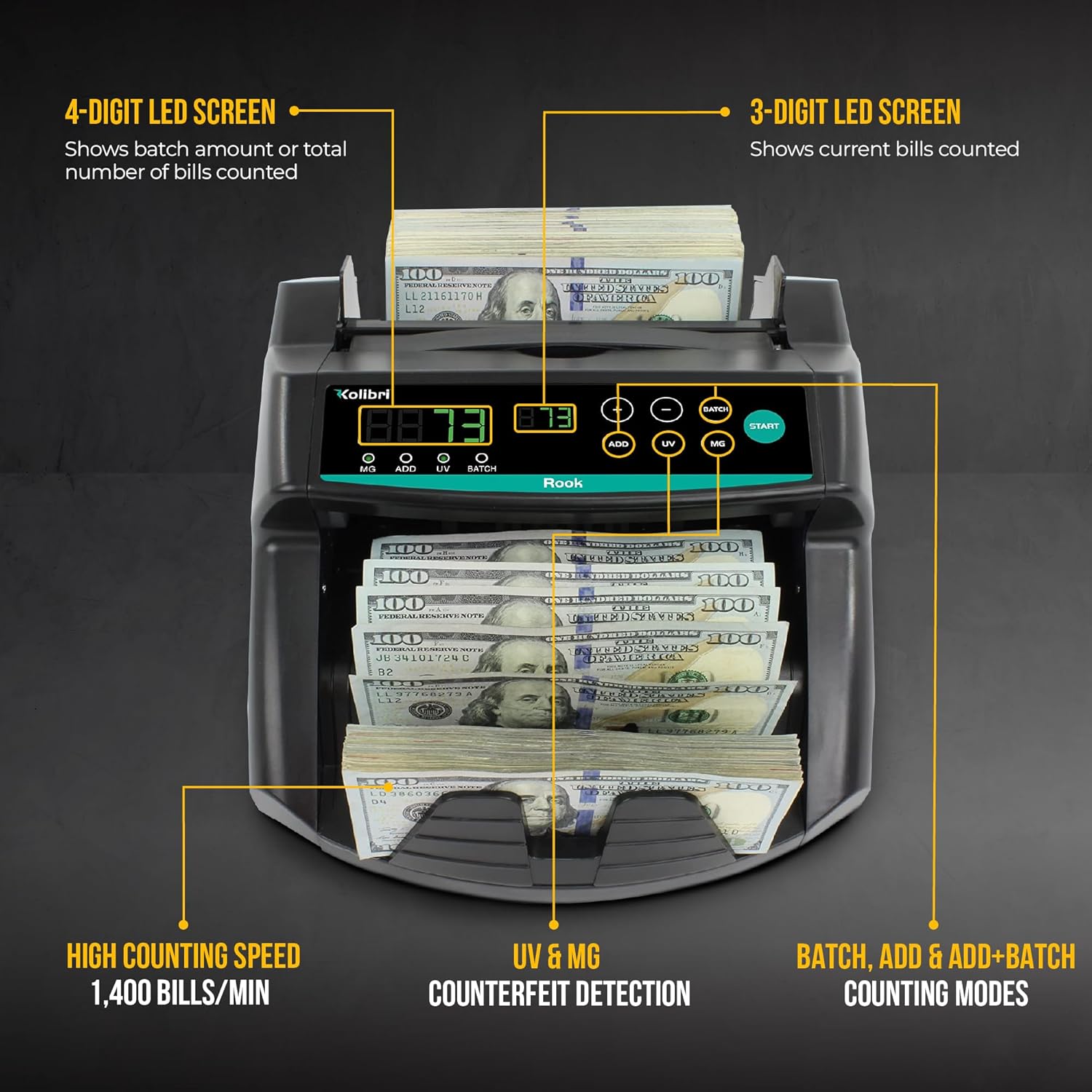 KOLIBRI Money Counter Machine, Rook with UV/MG/IR Counterfeit Detection – Count, Add & Batch Modes, 1,400 Notes per Minute - US Dollar Cash Counter with Dual LED Display (1-Year USA Warranty)