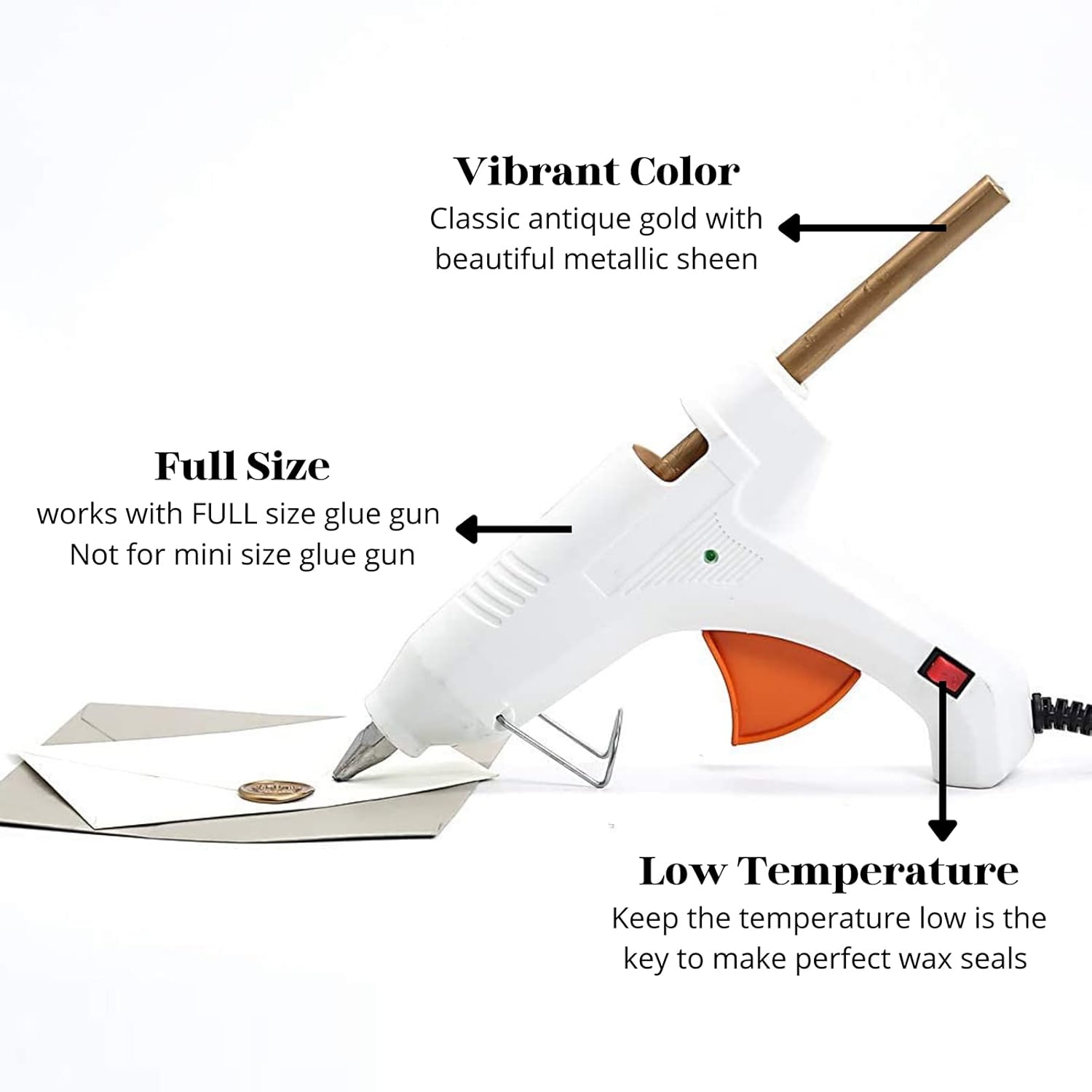 - Easy To Apply - Easily use together with a low-temp large standard 0.44" glue gun. Not designed for mini glue guns! If you plan to seal dozens of envelops, this is the most efficient method. To avoid the wax stuck to the stamp, you may put stamp on an ice pack in between every 4-5 impressions. Please remember the glue gun was designed for glue stick which requires a much higer melting temperature than the wax, so to keep the temperature low is the key.