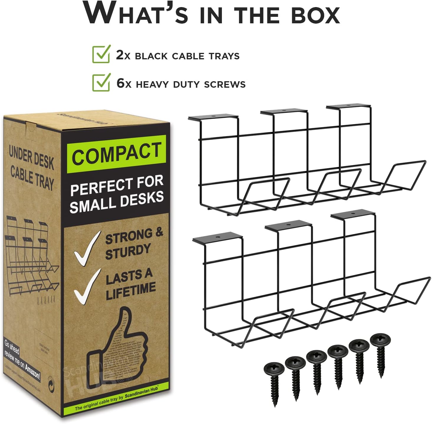 - Join more than 100,000 satisfied customers who have already untangled their cable mess with Scandinavian Hub cable trays. Our under table cable management kit is made out of steel, giving it sturdy construction and is the Strongest Kit on Amazon. These under desk wire organizers are fully welded and powder coated for long life.
