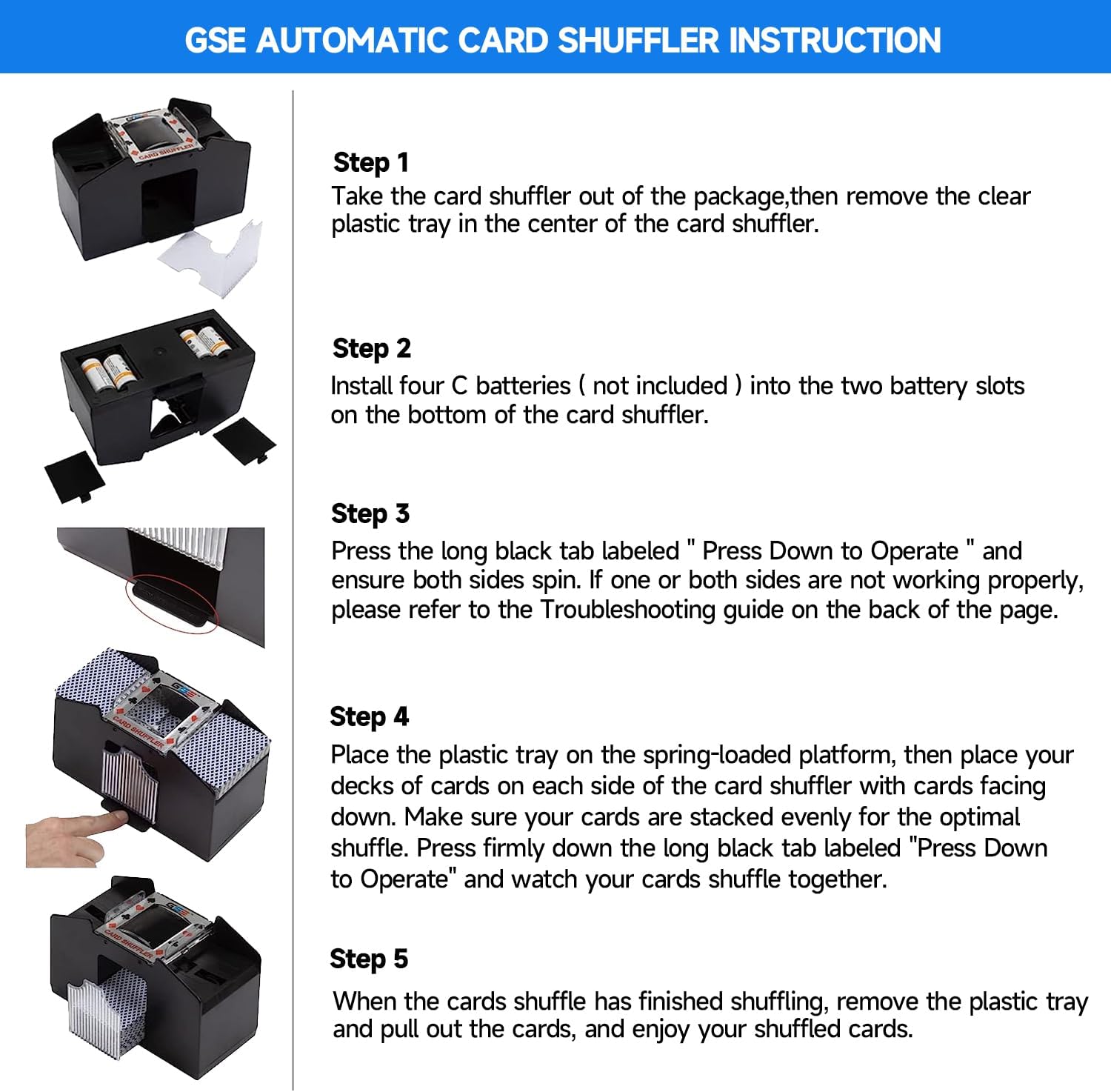 - Important Tip: The card shuffler requires four C batteries (batteries not included); flat cards and new cards work great, bend cards or old cards may not work (playing cards are not included)