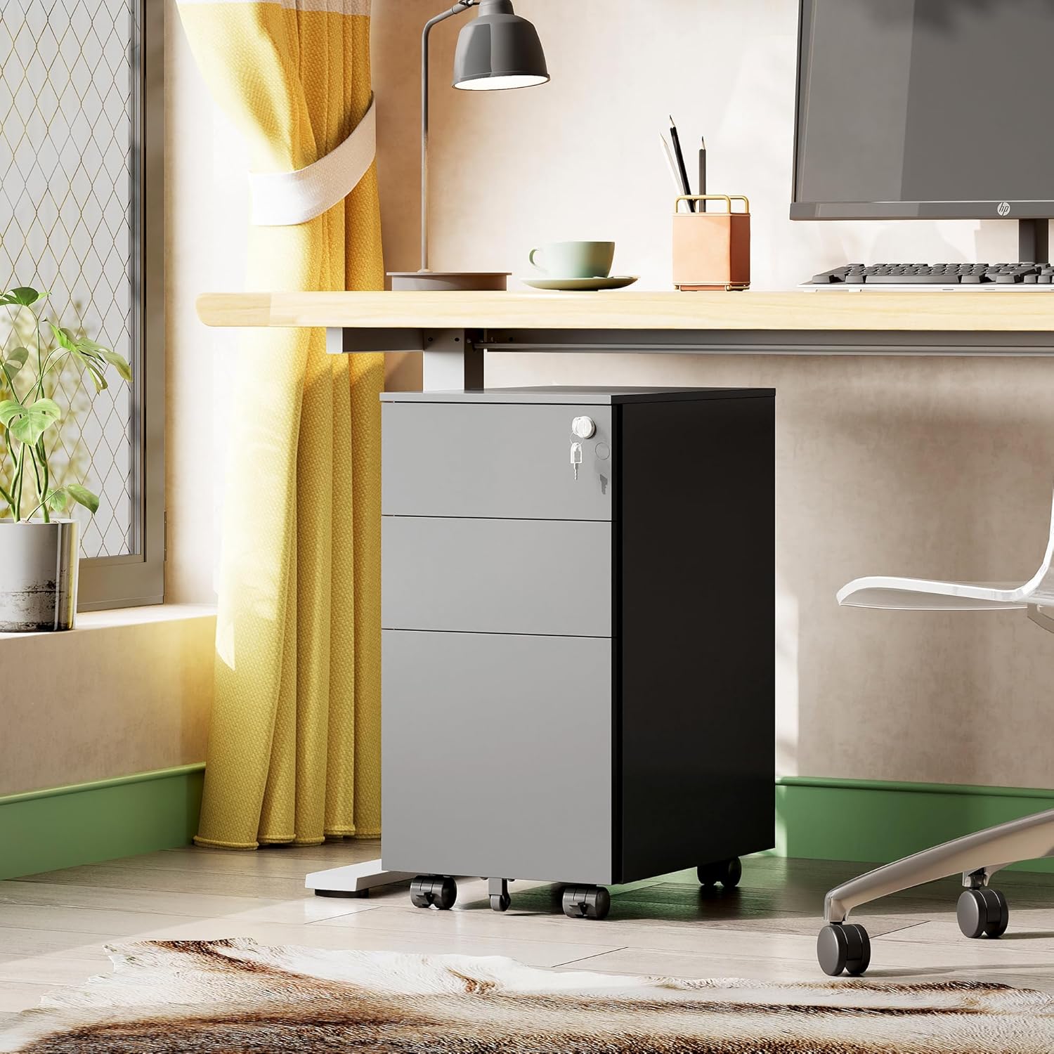DEVAISE 3 Drawer File Cabinet with Lock, Metal Rolling Filing Cabinets for Home Office, Small Under Desk Cabinet with Slim Width (11.8 inch), Black