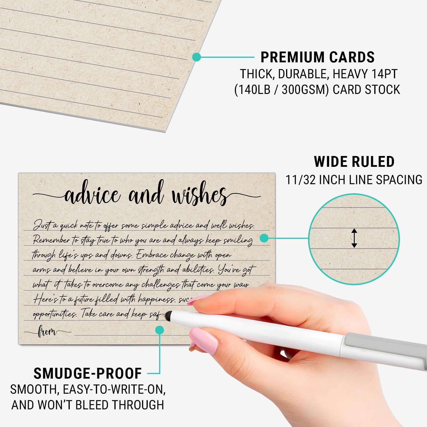 - Premium Card Stock: Thick, durable 14 pt (140 lb or 300 gsm) luxury card stock. Easy to write on, and won't bleed through.