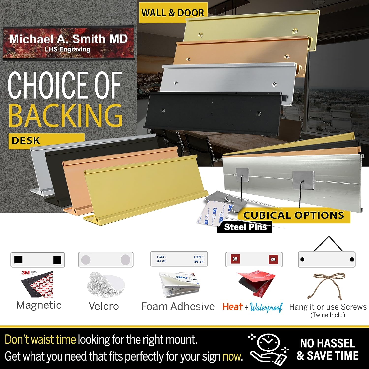 - 🟡 Click Personalize: Add 3 lines of text | Option to add a desk, wall or a door holder or choose adhesive, hanging, cubicle pins, or all weather adhesive option