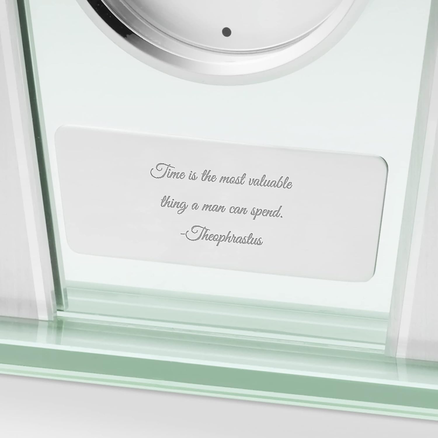 - SUPERIOR QUALITY AND DESIGN – This personalized polished glass and silver tone clock makes an impression with a sleek design, dots at the quarter hour and stands 7.3 inches tall.