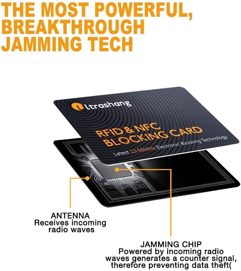 - BREADTHOUTH JAMMING TECH, KEEP YOUR PRIVACY & FINANCIAL INFO SAFE - A vital addition to anyone in nowadays. The blocking card adopts LASTEST 13.56MHz electronic blocking technology, when upon scanning, it will draw energy from the reader and emit an interferential signal to jam the transaction or hack. It creates a 6cm radius field, prevent skimming from your contactless device, so all your money and privacy info of bank cards, passport, driver license are safety