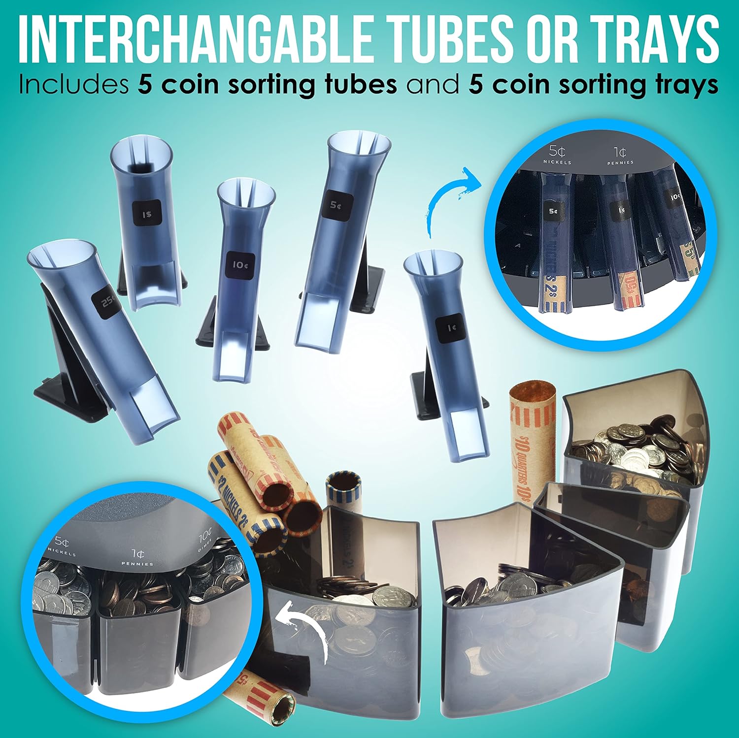 - 🏦 Multi Use: Coin tube attachments included to automatically and easily fill preformed coin wrappers. Simply place the coin wrappers into the tubes, set the one-touch tube batch setting, press start, and watch them fill up. The machine will automatically stop when a roll is full. Or you can use our Custom batch settings so you can use both the coin trays and tubes at the same time, making coin rolls for some denominations while other coins fill up the bins.