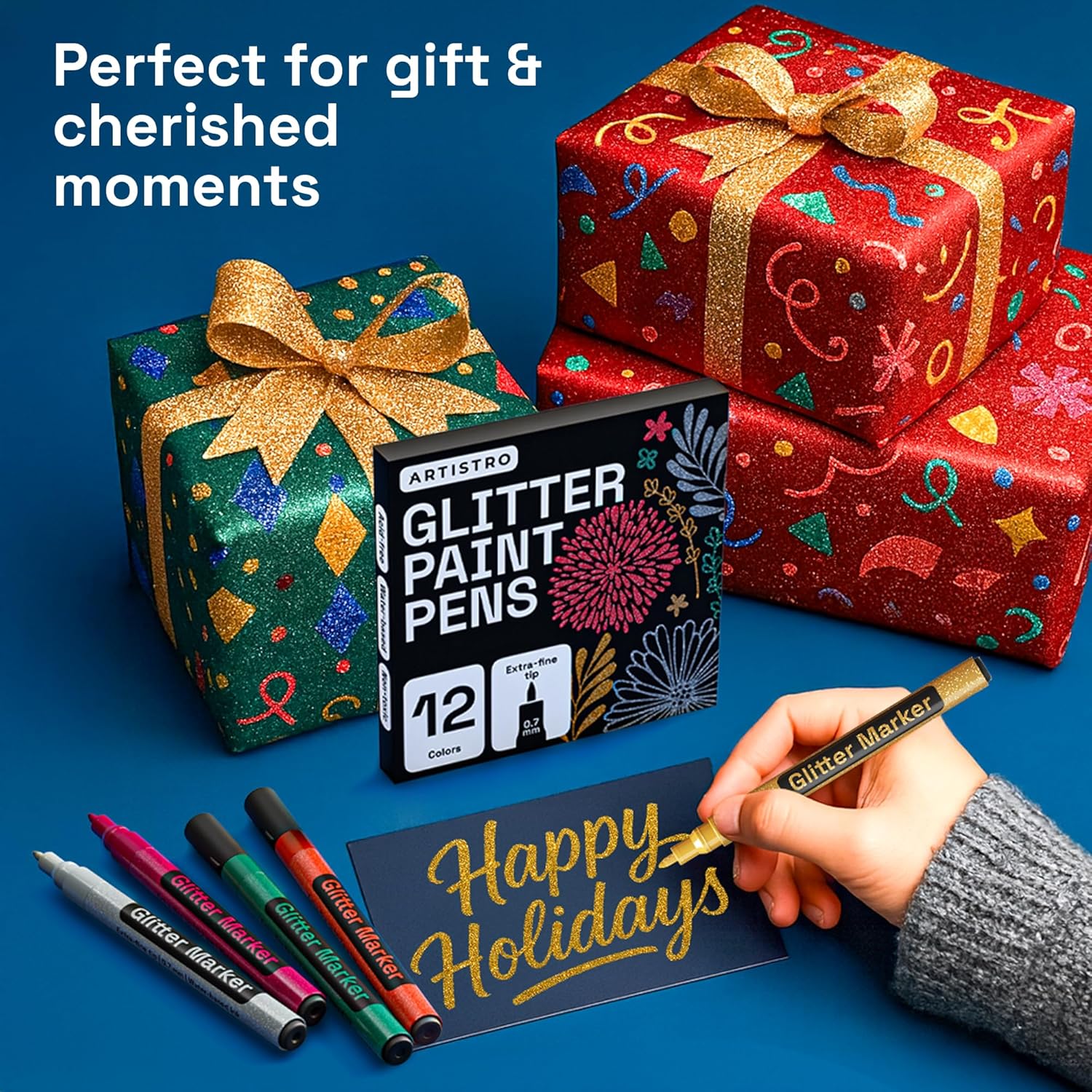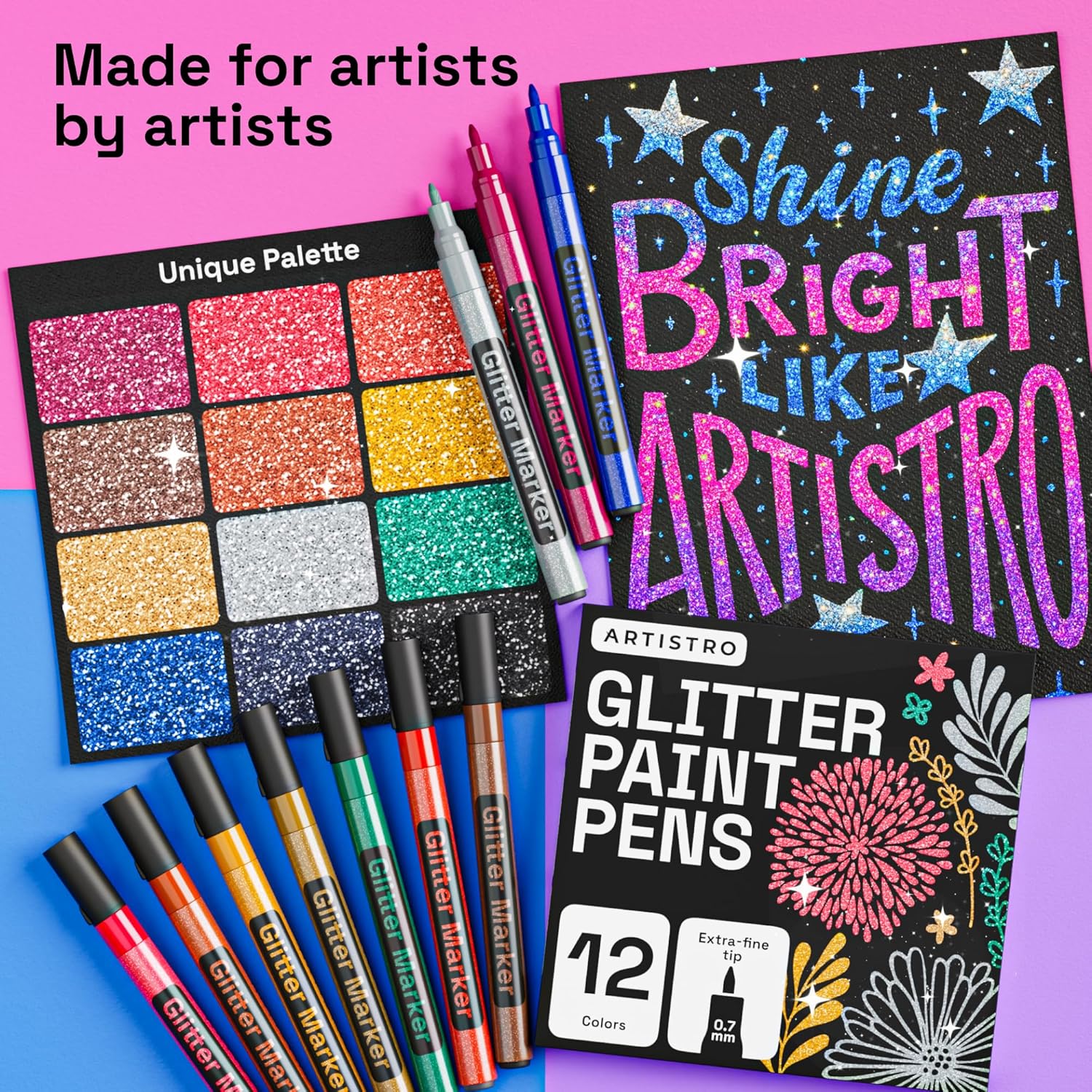 ARTISTRO 12 Glitter Paint Pens Sparkly and Shiny for Glass, Rock Painting, Ceramic, Wood, Fabric, Scrapbooking, DIY Craft Making, Coloring - Acrylic Paint Markers Extra-Fine Tip 0.7mm