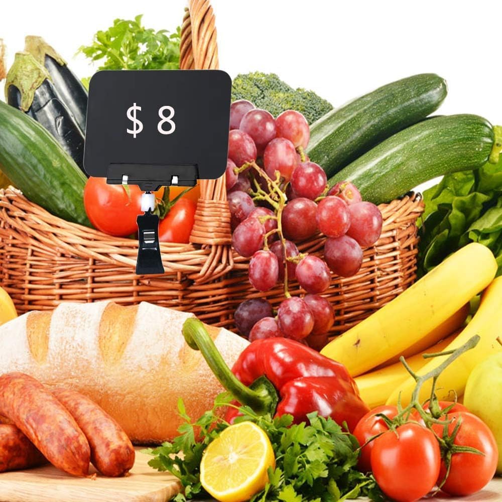 - Erasable Price Tags: The chalkboard sign has a smooth surface that can be easily written on with any type of liquid chalk, and can also be easily wiped clean with a sponge for reuse (not writable with chalk). The pop-up clip-on sign holder measures 8.2 x 5.8 inches, with plenty of blank space for you to write on