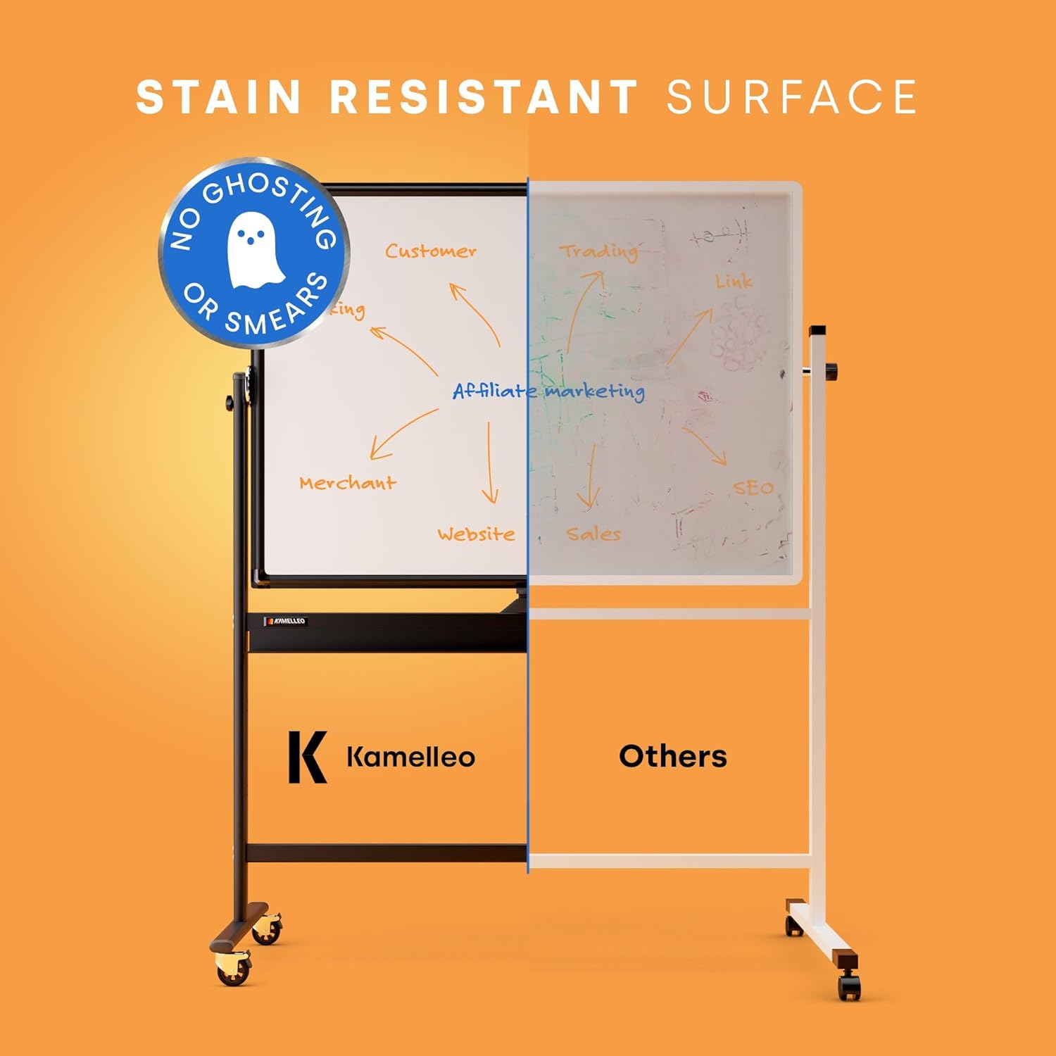 - Built to Last: Whether used in the office, classroom, or home, Kamelleo’s mobile dry-erase whiteboards are designed to hold up over years of frequent use. While other whiteboards will stain or break due to poor construction, our dry-erase whiteboards are known for their durability and reliability when you need it most!
