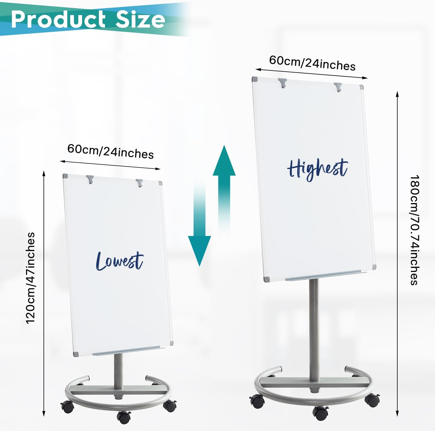 - Adjustable Height: Our whiteboard on wheels could be adjusted the height from 47 inches to 71 inches. No matter how tall you are, you can adjust to the height that suits you