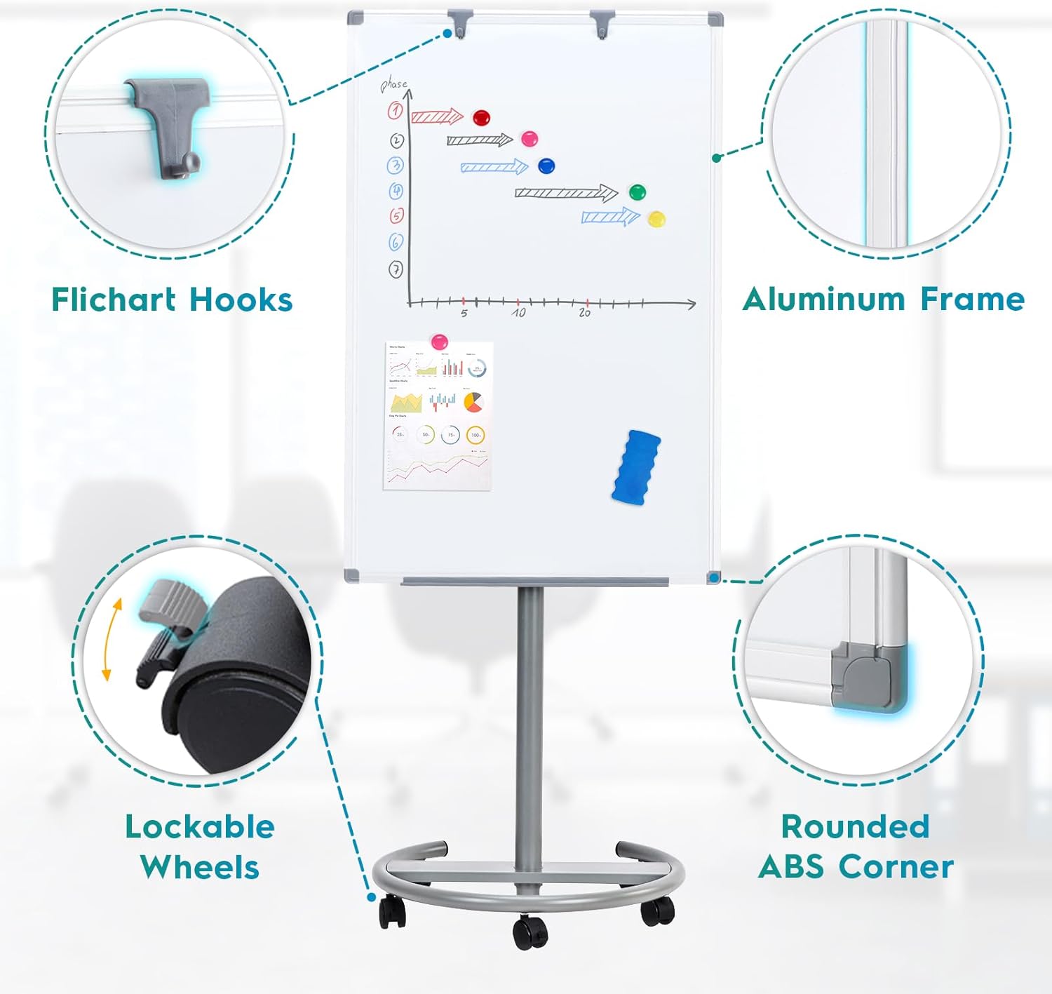- Movable & Stable: With round wheel base design, rolling white board can be easily moved and carried to any classroom, conference room, or studio. Each wheel has a lock to ensure that it does not slide during use