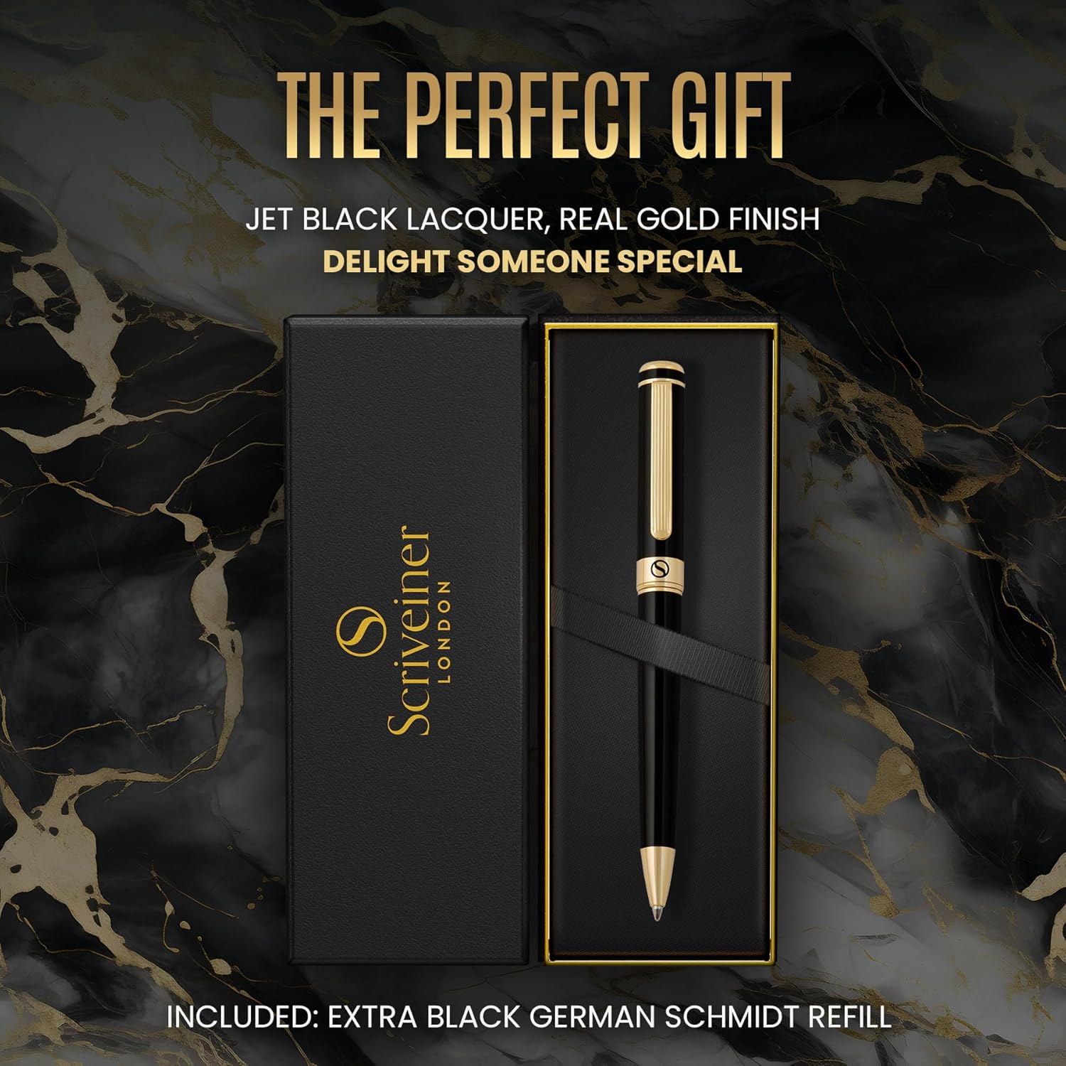 Scriveiner Black Lacquer Ballpoint Pen -Stunning Luxury Pen, Real Gold Plating, Schmidt Black Refill, Best Gift Set for Men & Women, Professional Executive Office, Nice Fancy Designer Pens