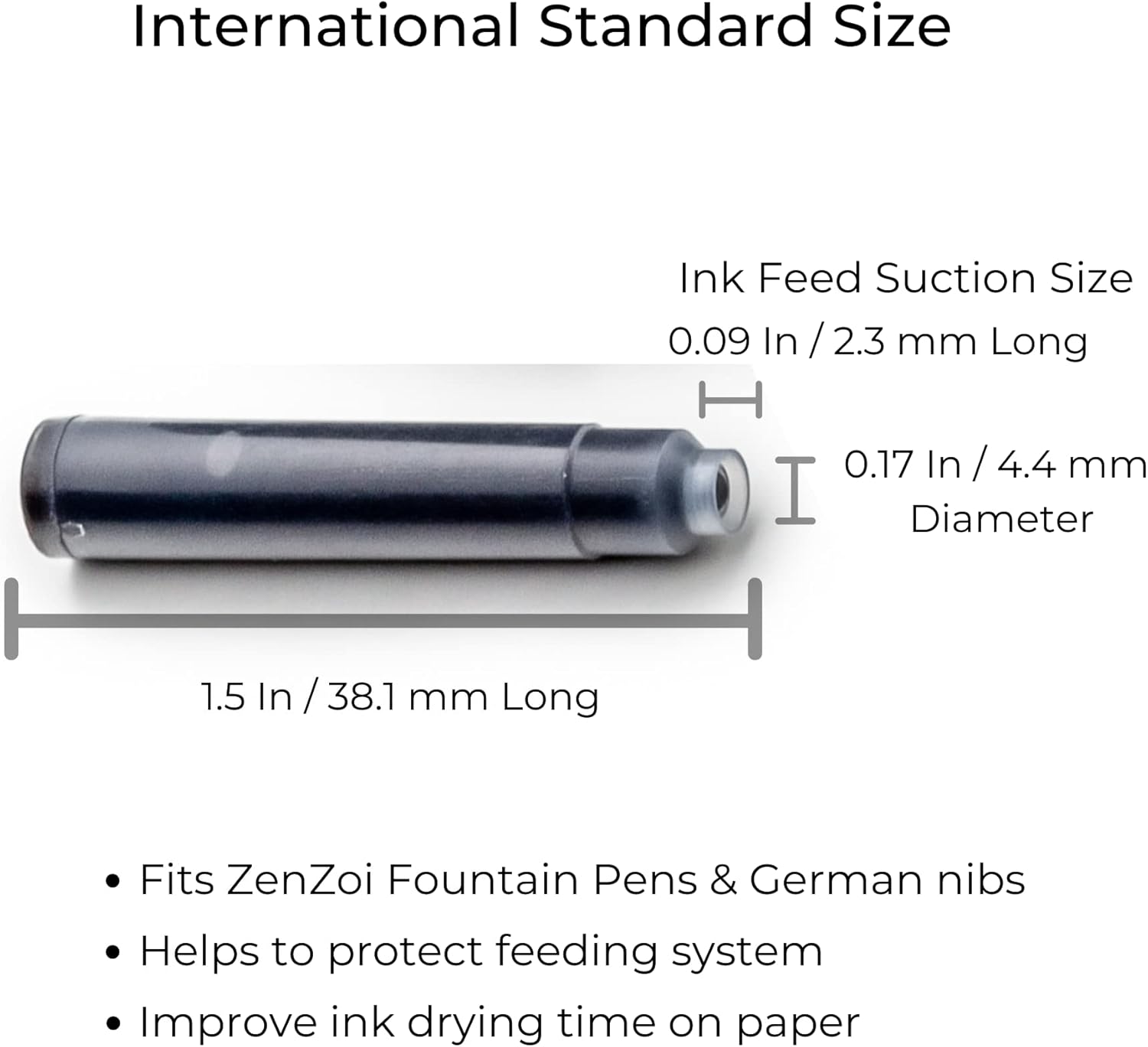 - INTERNATIONAL FIT- Our fountain pen refill cartridges were designed for the luxury pen owner’s ultimate convenience. Zenzoi standard international size ink refills fit into most standard fountain pens, especially German Schmidt Nibs available on the market. Cartridges fit German and Japanese 2.3mm feed suction.