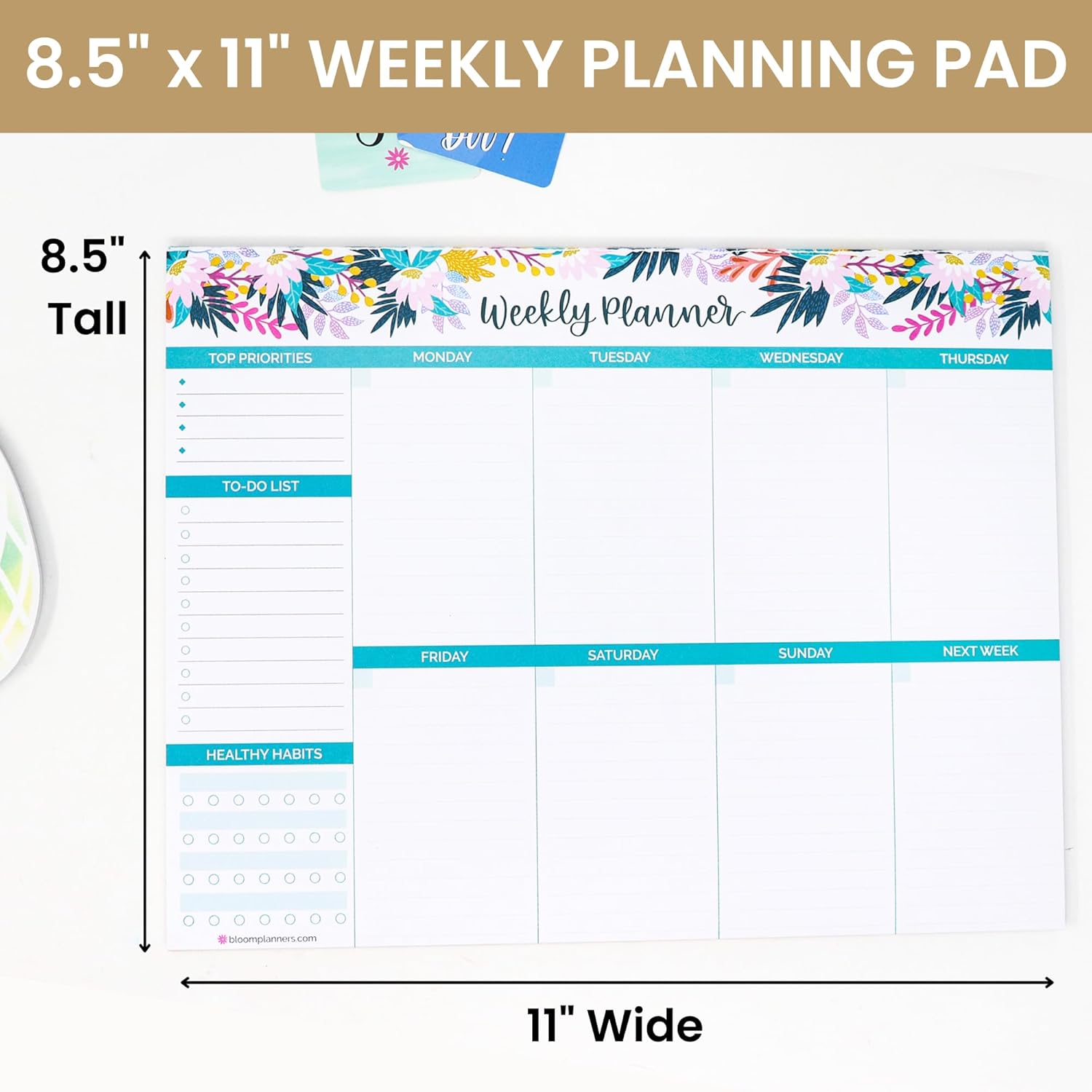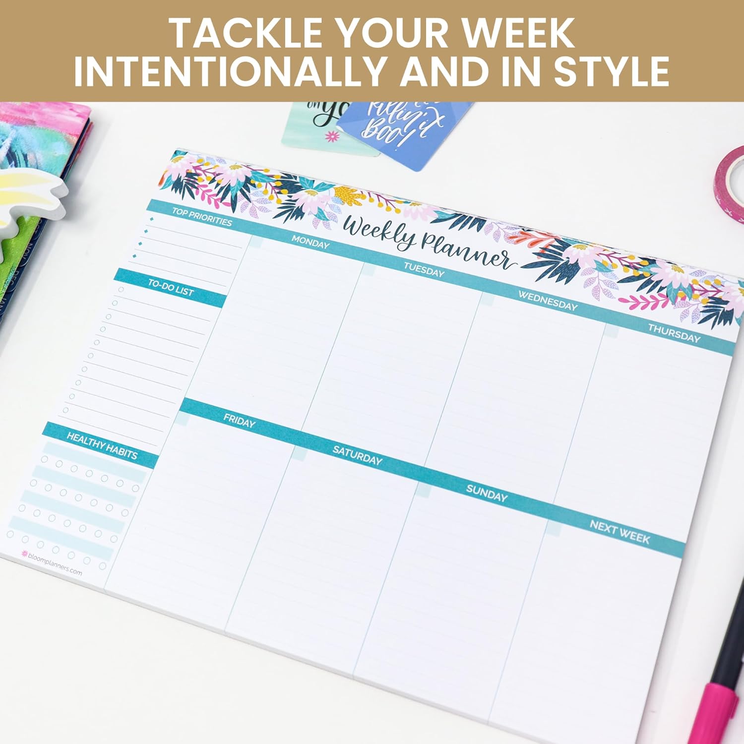 bloom daily planners Horizontal Weekly Tear-Off To Do List Planning Pad - Undated Notepad Organizer & Healthy Habit Tracker - 8.5” x 11” - Floral