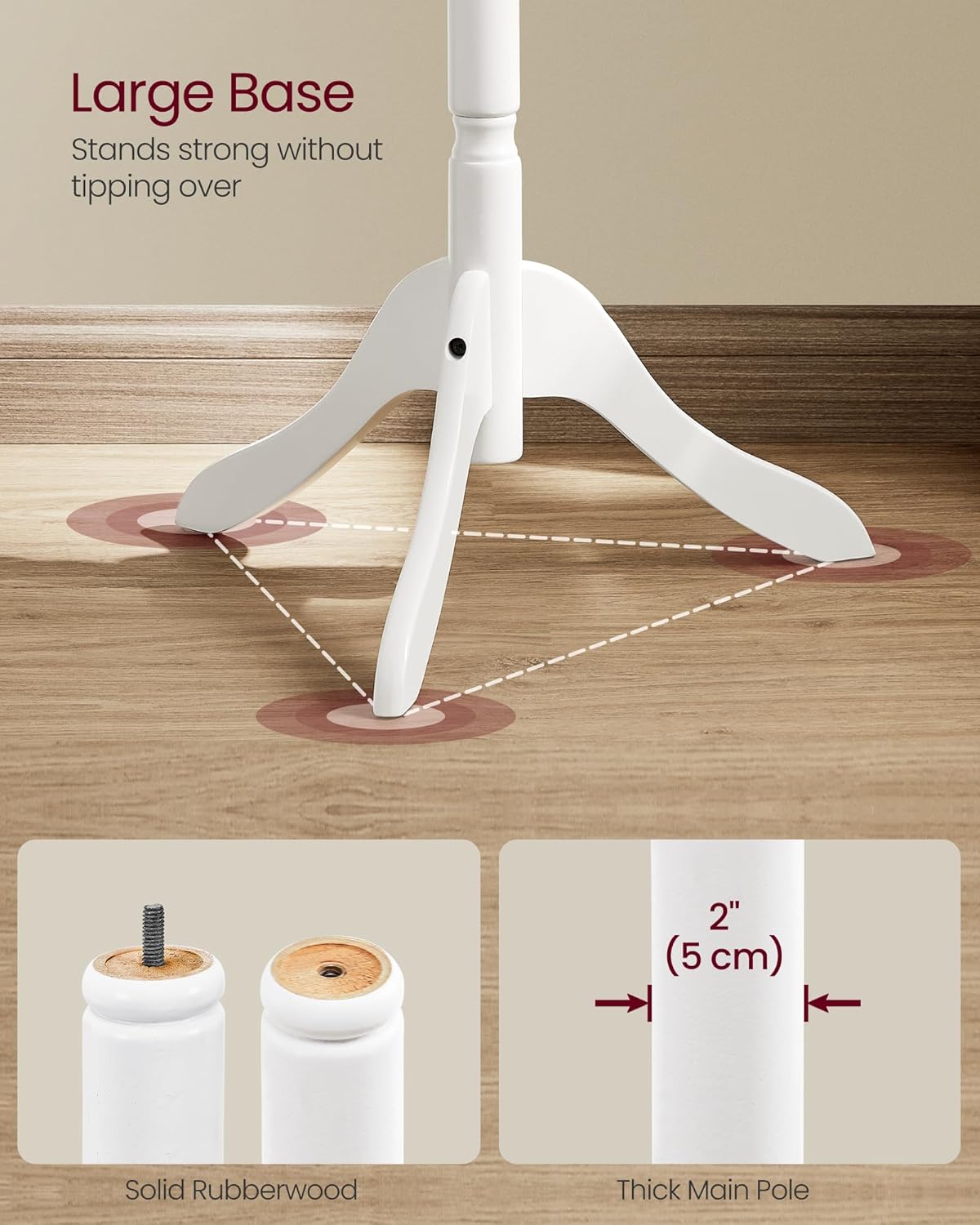 - [A Stable Tree] What good is a coat rack that falls over the moment you put a coat on the hook? This durable coat tree made with a 2” thick, solid wood pole and an 18.5” diameter tri-legged base was designed with stability and sturdiness in mind