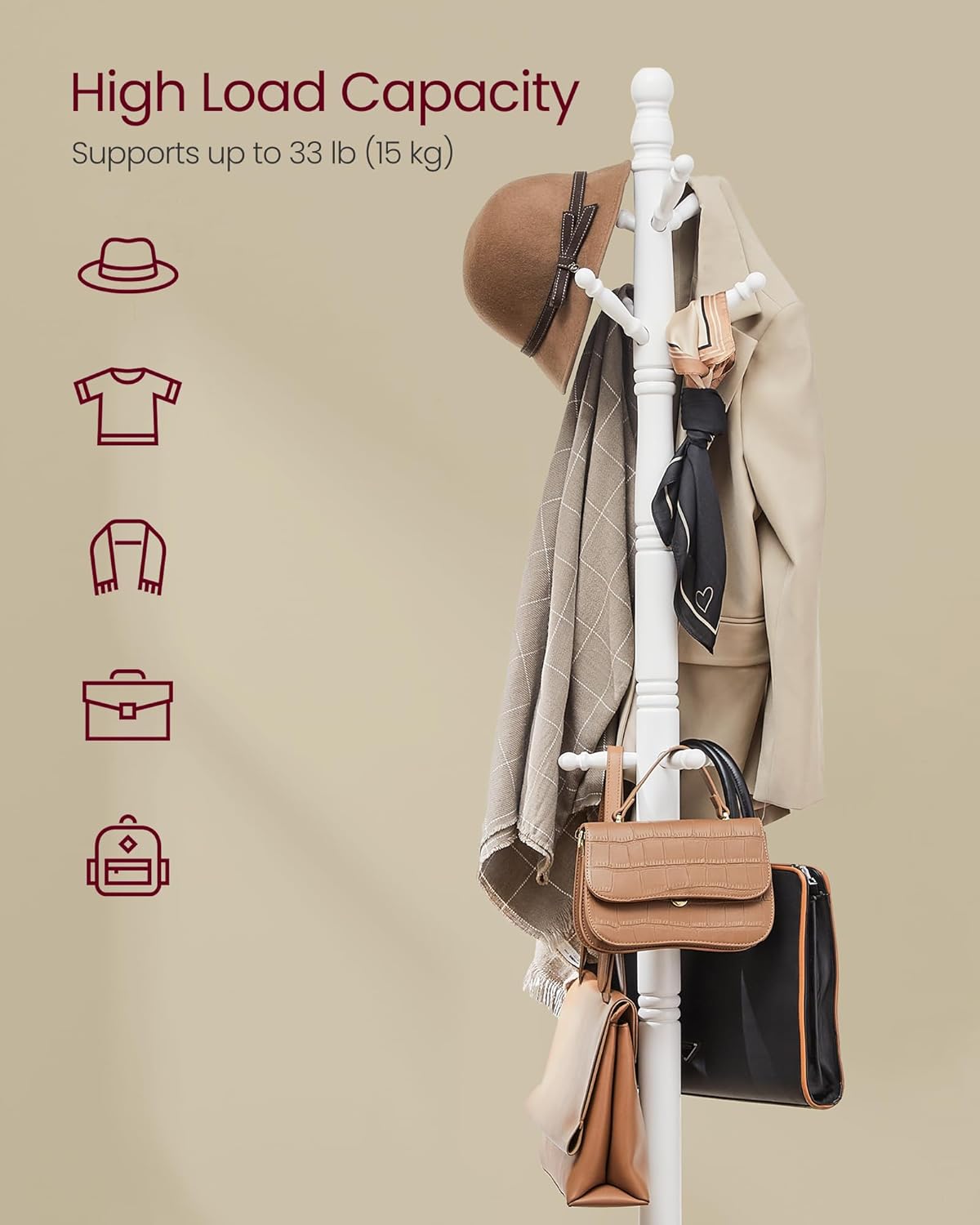 - [A Spot for It All] With 9 rounded arms that will gently hold jackets and bags up to 11 lb each (max. total load: 33 lb), plus the unique top knob perfect for stray hats and caps, you have 10 available spots for just about everything on this free standing coat rack
