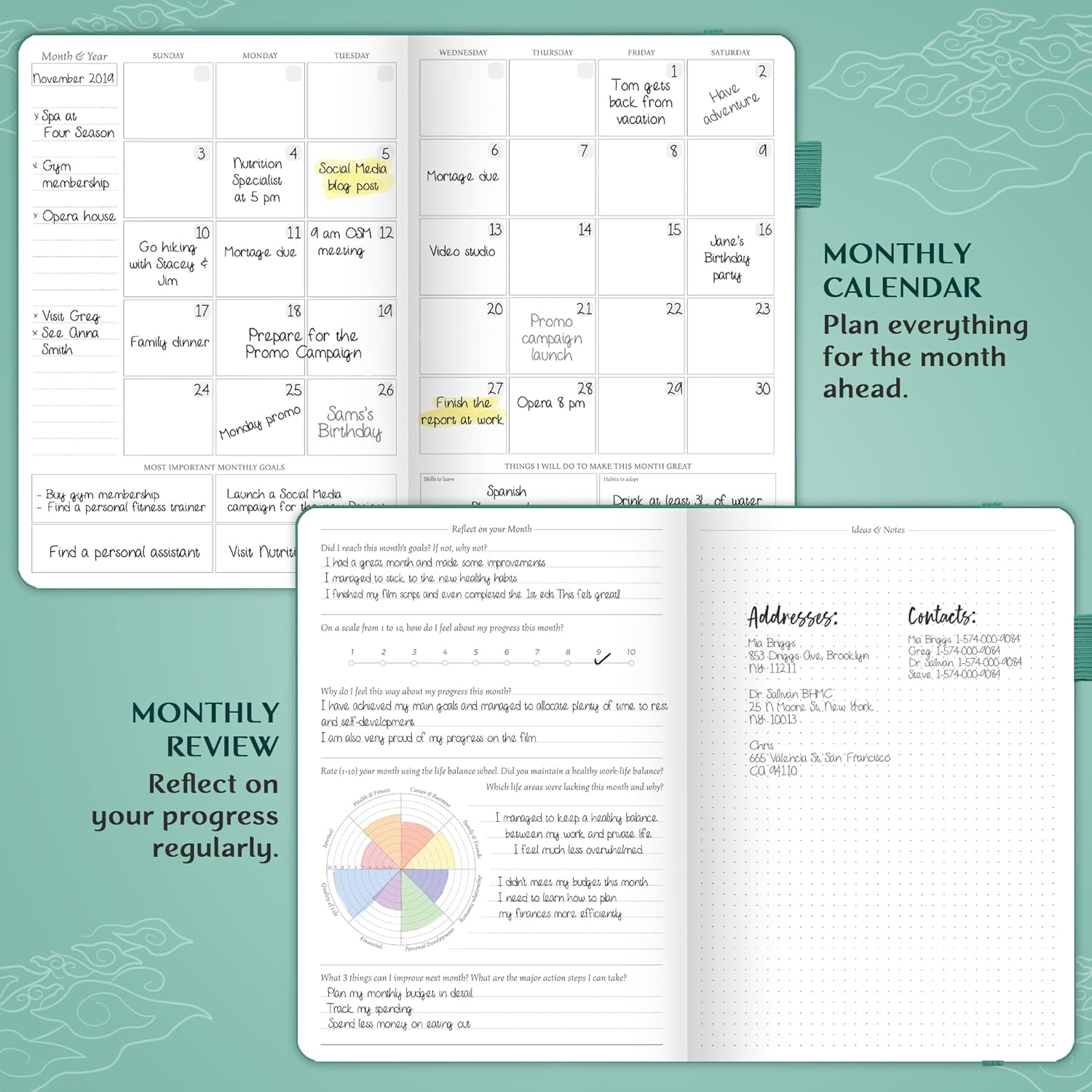 - STAY ORGANIZED & BOOST PRODUCTIVITY – Use spacious monthly calendars and weekly views to plan tasks, deadlines, and appointments. Reflect on your progress regularly with comprehensive monthly reviews.