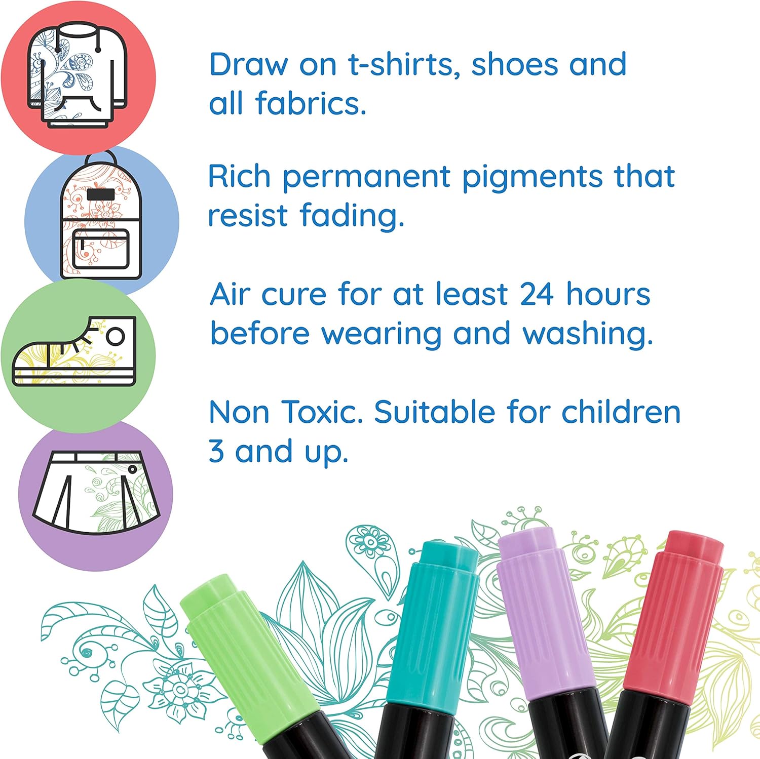 - Fun, Safe and Easy to Use: They're completely kid safe, as they are non-toxic, fade proof, washerproof and conform to ASTM D4236 and EN71 certifications for art products. They are suitable for children 3 and above and have child safe breathable caps. Everyone loves our Crazy Colors fabric markers, because of their ease of use and the exceptional vibrant visual results they achieve with them.