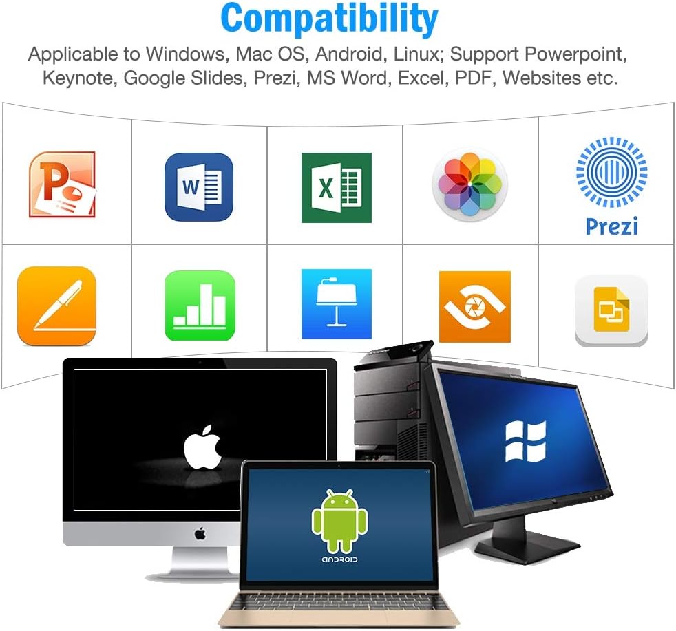 - 【Wide Compatibility】: Computer clicker for powerpoint presentations supports systems: Windows 2003/XP/Vista/7/8/10 or above, Mac OS, Linux, Android;Wireless powerpoint presentation remote clicker supports software: PowerPoint,Excel,Prezi, iWork (Keynote & Numbers & Pages), Website and etc