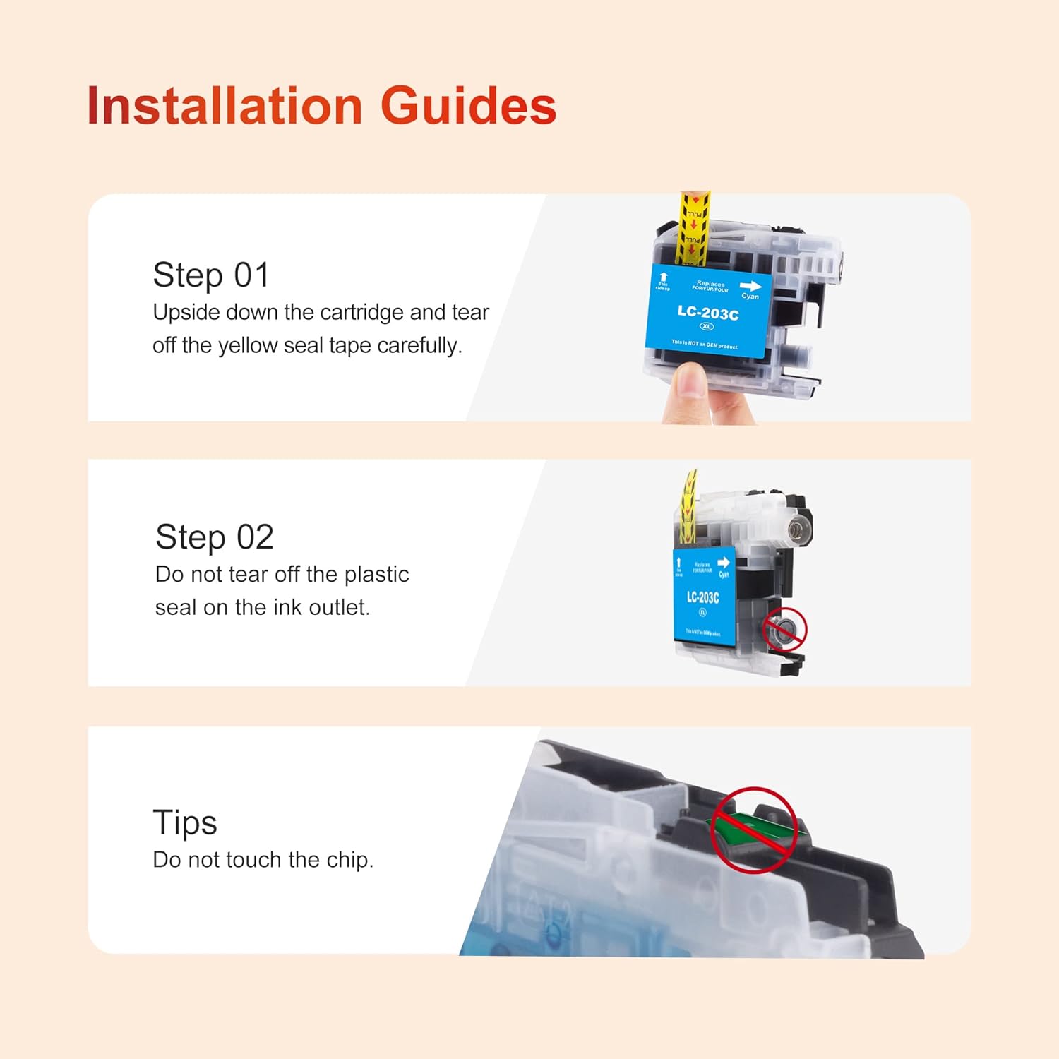 - Upgraded LC203 Ink cartridges Brothers printer: Equipped with upgraded intelligent chips, ejet for Brother LC203 ink cartridges LC201 ink cartridges could be smoothly recognized by compatible printers and display accurate ink level, you can enjoy worry-free and efficient printing