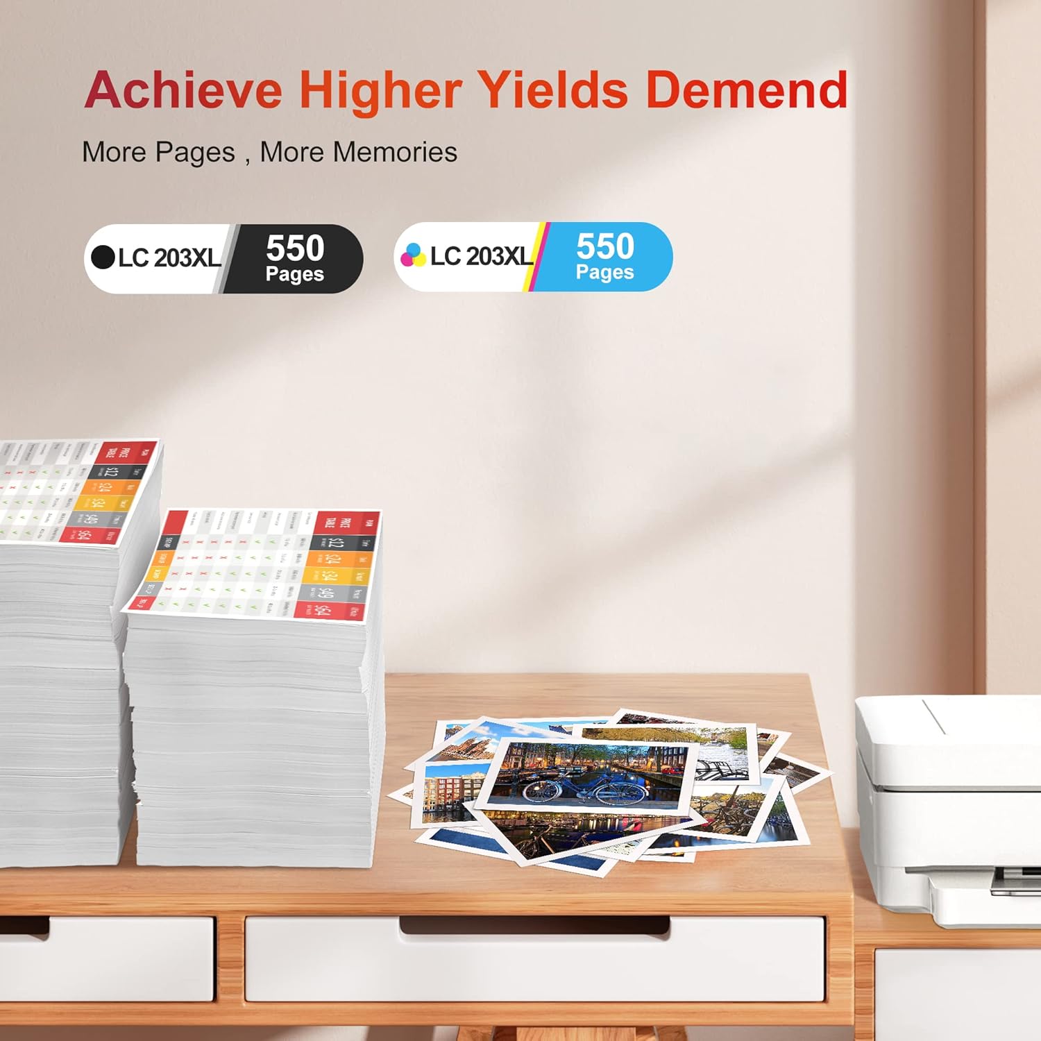 - High Page Yield: Up to 550 pages per LC203XL LC203BK, 550 pages per LC201CL Bother Ink Cartridges Color (Based on 5% coverage)