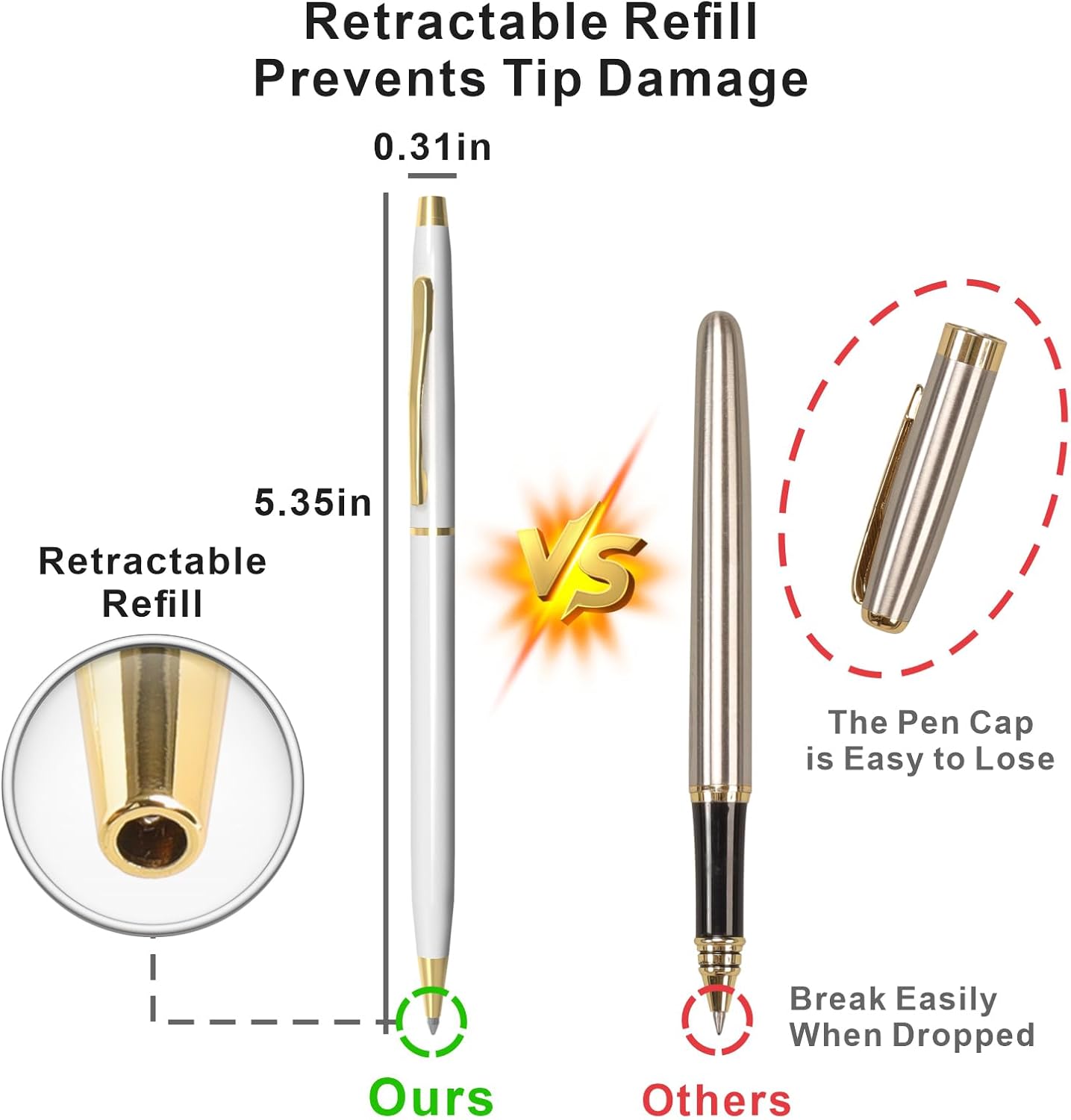 - Classic Black Ink Pens: The white pens measure 5.35" (H) with a sleek 0.31" (D) barrel; Ideal for men, executives, flight attendants, police officers, students, business meeting, office, college, wedding, or everyday professional use as uniform pen, guestbook pen, wedding pen, etc