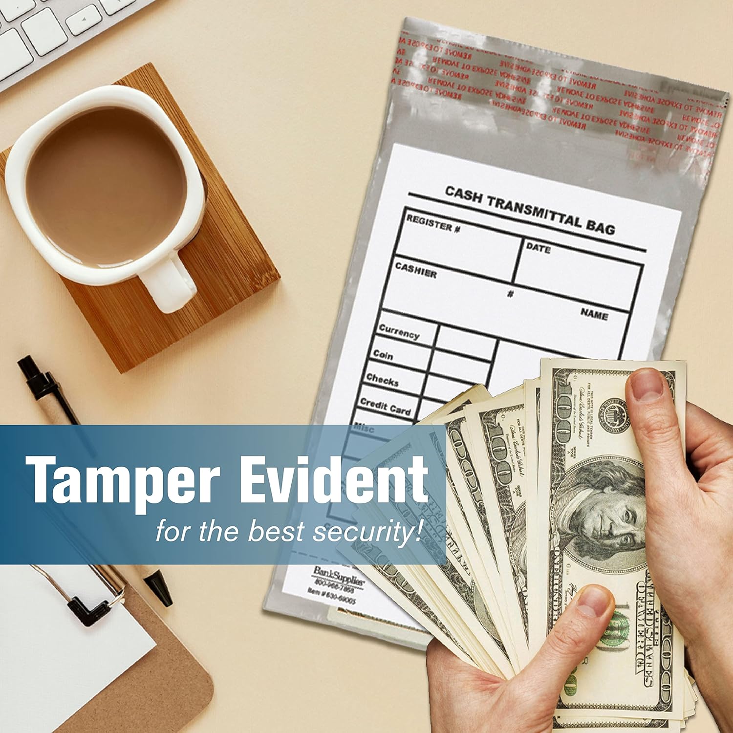 - CASH TRANSMITTAL BAG: Use this clear plastic cash bag for skimming cash from point-of-sale locations. Simply allow employees to pack in money, receipts, and other items to safely transport them to the next place it is needed