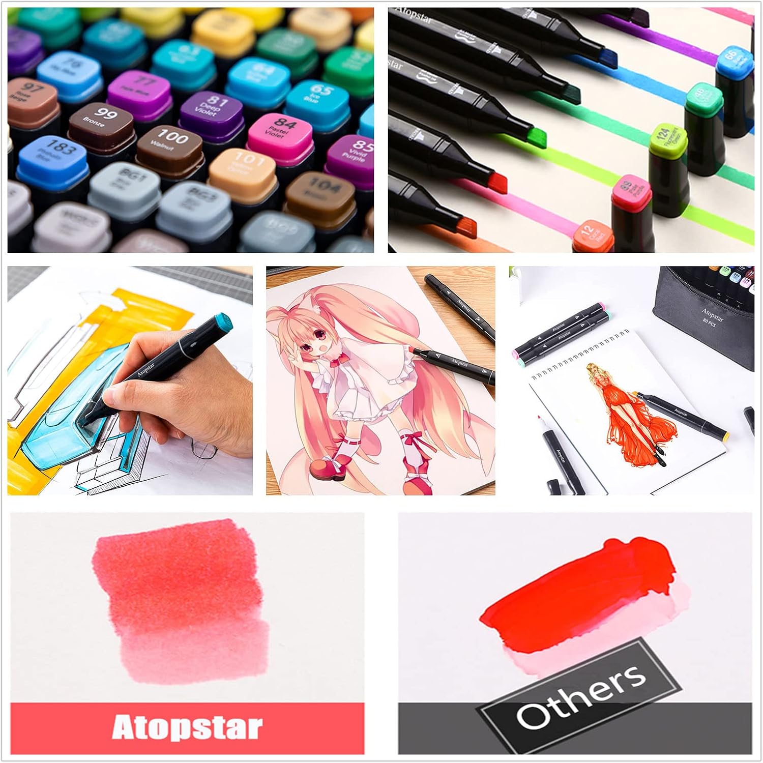 - 【BEAUTIFUL COLOR】80 colors unique art marker Bring your art to life. The alcohol marker can be used on plastic, glass, wood, metal and textiles. It is widely used and provides you with all the colors you need. Includes all the primary and secondary color shade tones artists need for drawing,sketching,illustrating,designing, rendering, manga, letter, poster,anime, adult coloring books and more.