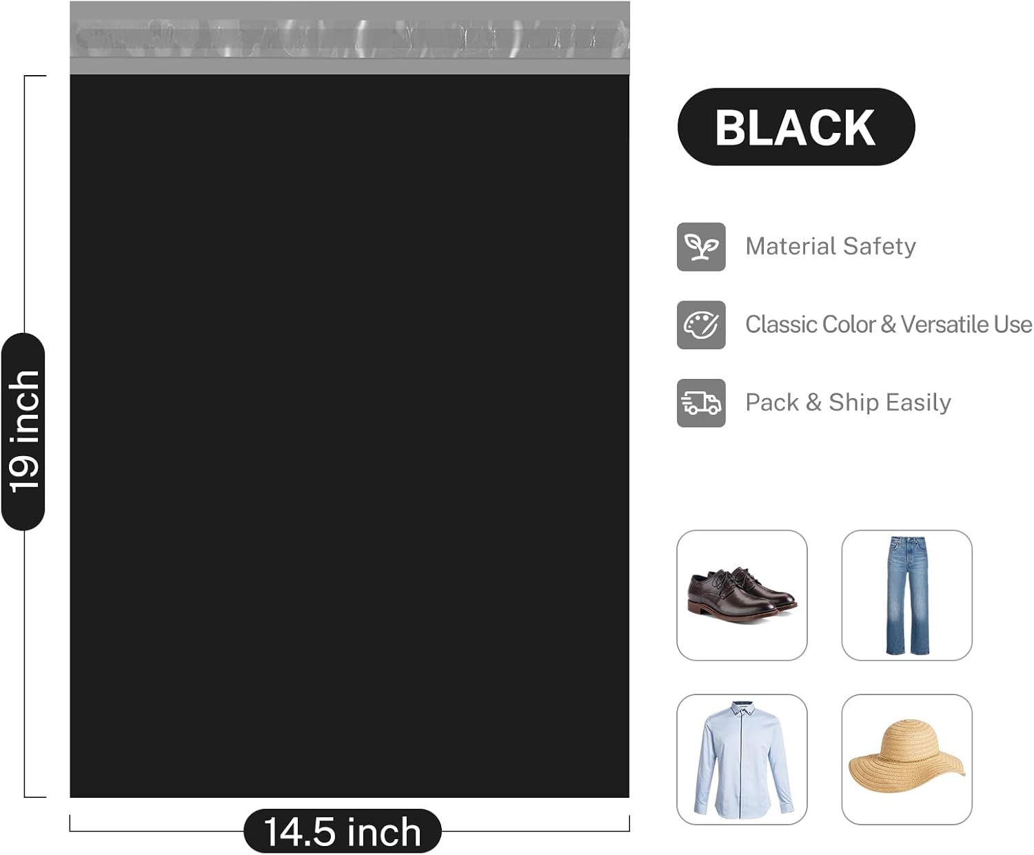 - Large Poly Mailers- Our poly mailers offer a reliable and efficient shipping and packaging solution for your retail or online small business. Measuring 14.5 x 19 inches, these lightweight envelopes come in a pack of 200, making them easy to use and ship.
