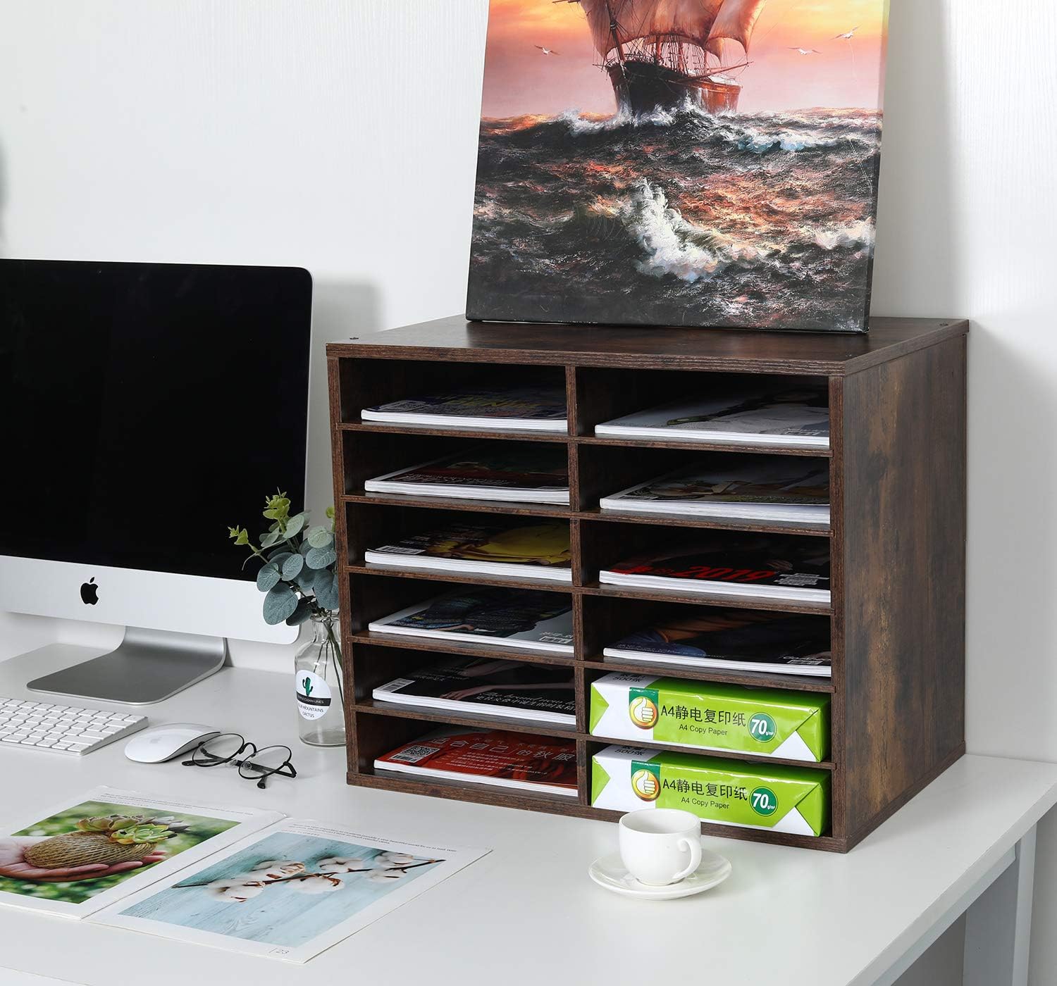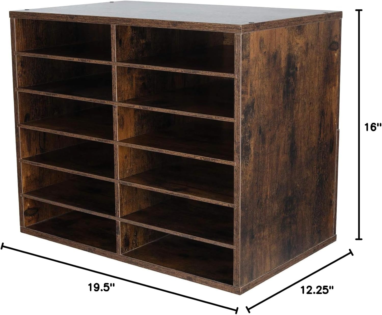 - 12-Compartment Mail Sorter Organizer: Hold 500+ A4 paper sheets in each compartment in this mail organizer. With 12 compartments (12 x 9 x 2.1 inch eash slots), store comics, magazines, and travel brochures effortlessly. EPA-certified particleboard ensures long-term durability for office/classroom use.